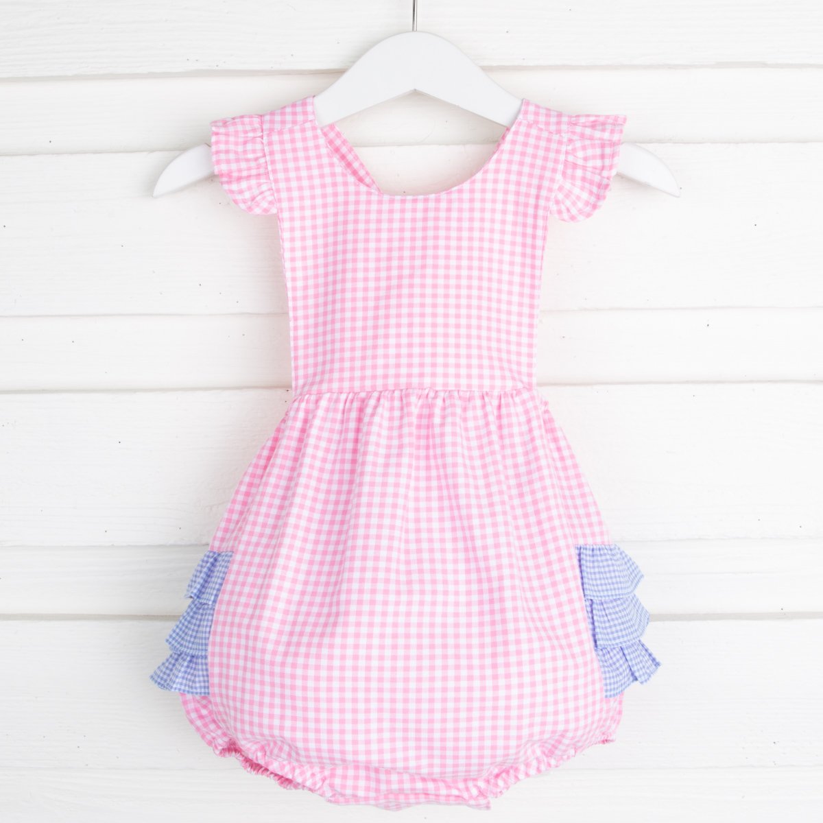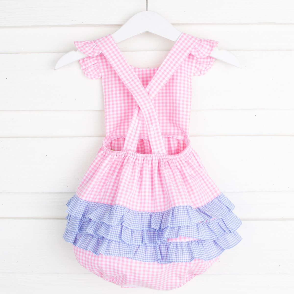 Your little one will look adorable in this pink gingham bubble with blue gingham ruffles. This cross back ruffle bubble style is an absolute favorite! Snaps in the stride.