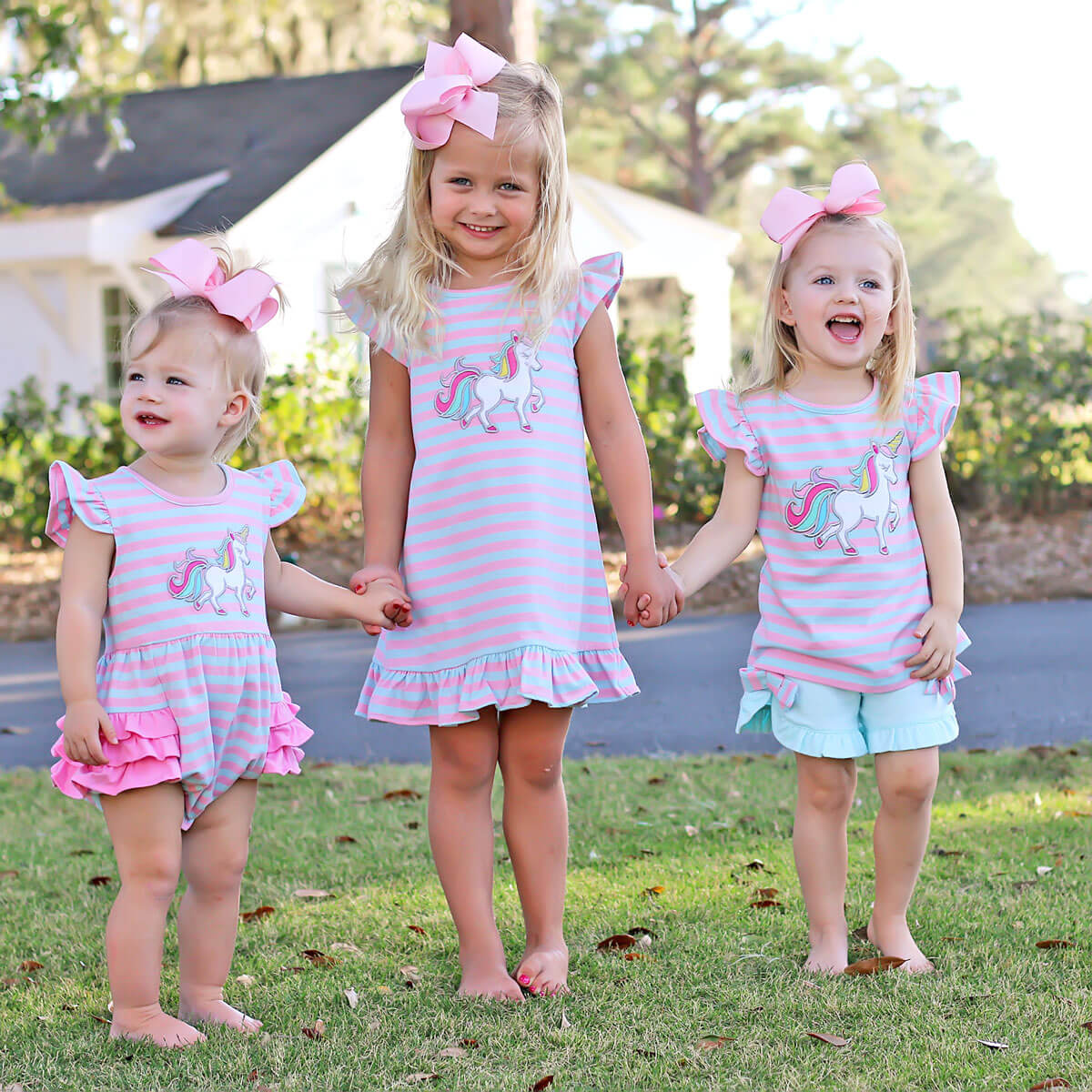 Your little girl will love this adorable pink and blue stripe ruffle bubble! Features unicorn applique with solid pink ruffles.