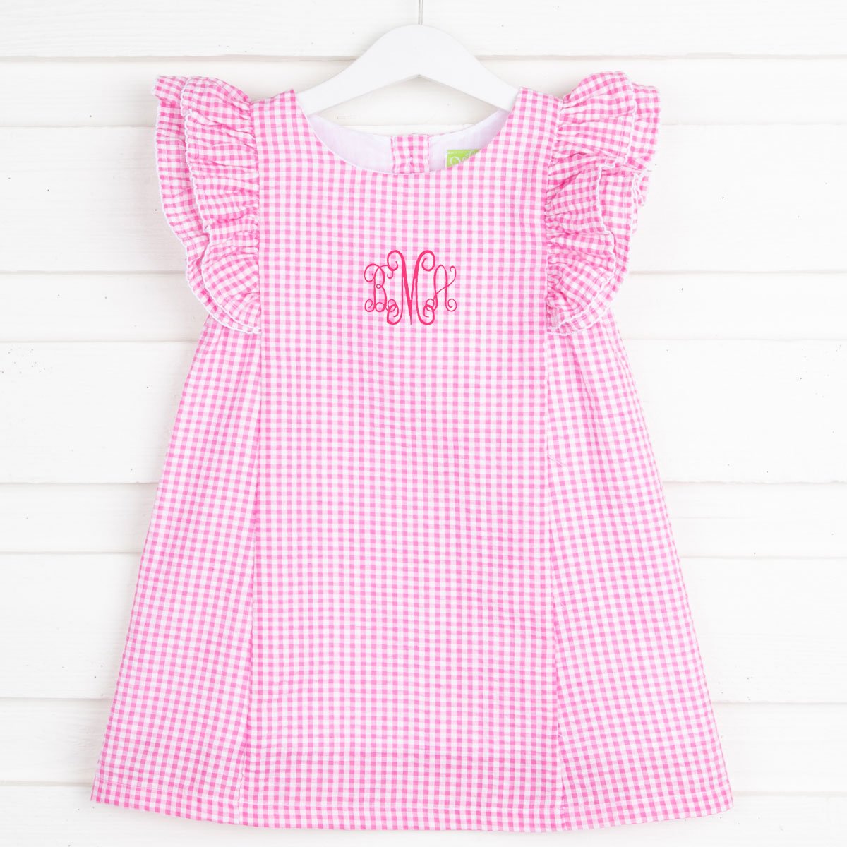 Precious pink gingham ruffle dress for your little girl! Features white picot trim on the sleeve ruffles.