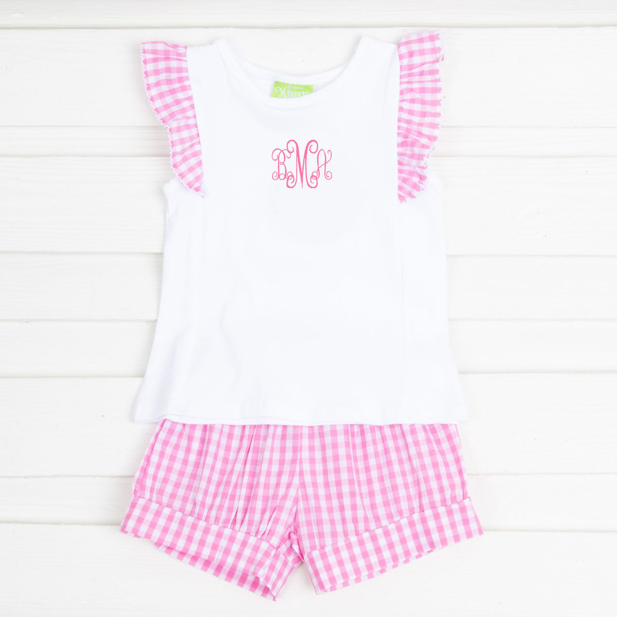 Adorable pink gingham ruffle short set! Features solid white knit top with pink gingham ruffles and shorts. Perfect for any occasion!