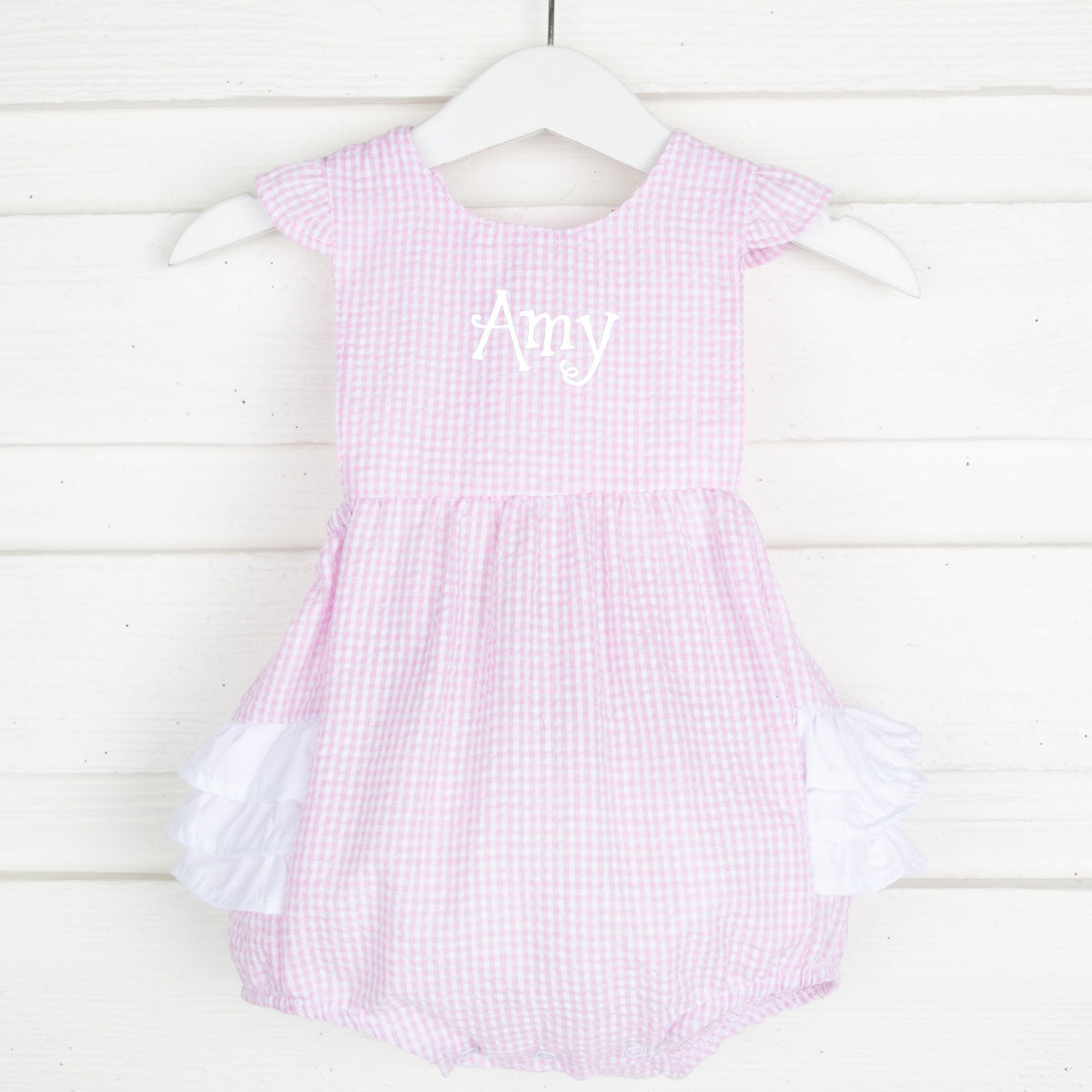 The sweetest ruffle bubble in our pink gingham seersucker fabric! Features solid white ruffles. Perfect for all season long! Snaps in stride.