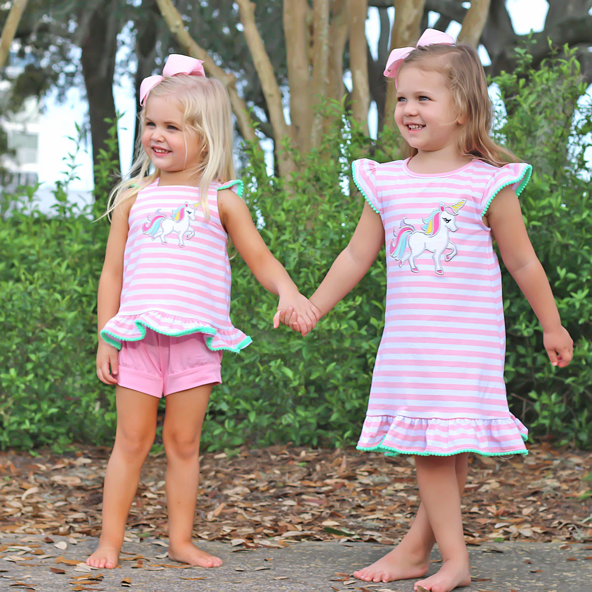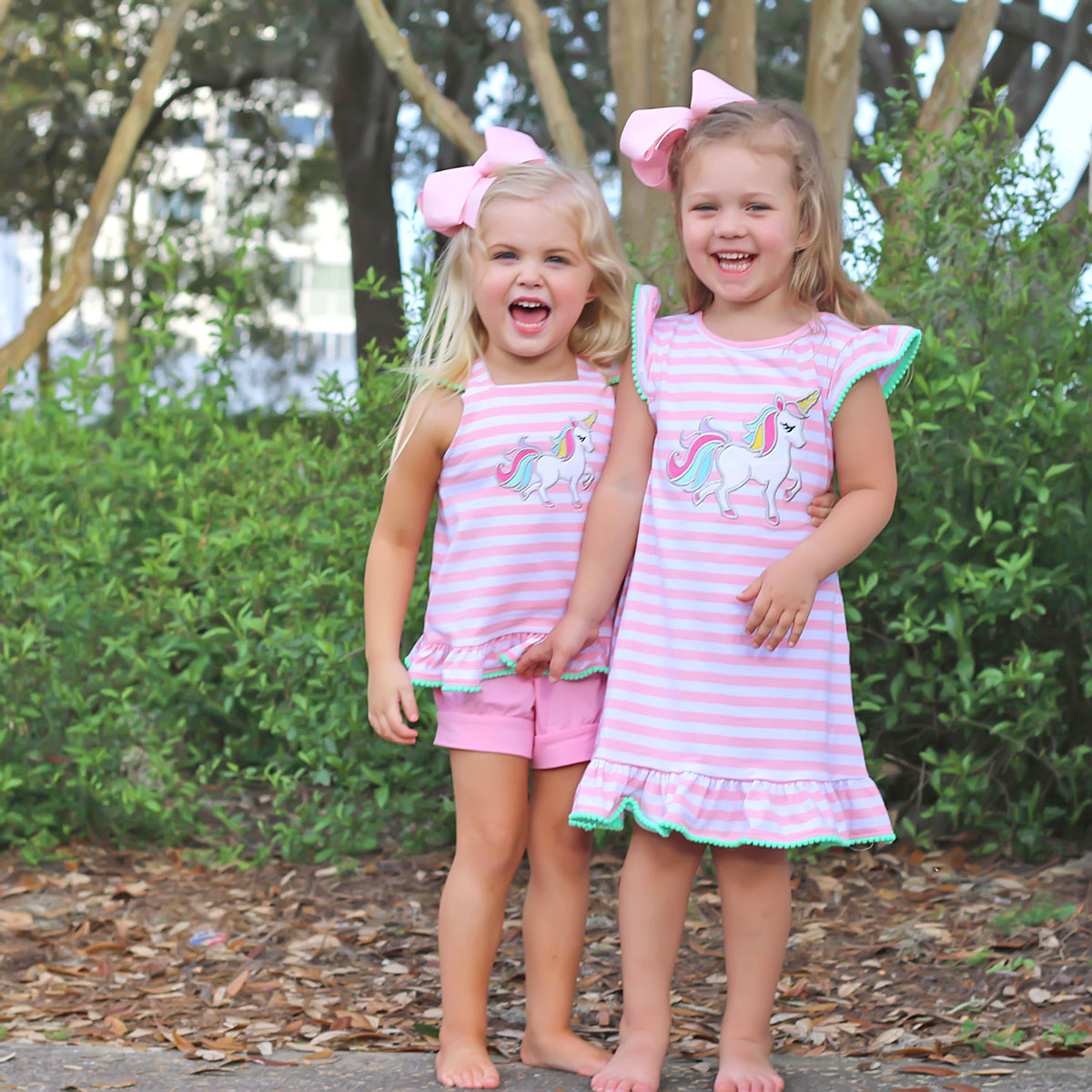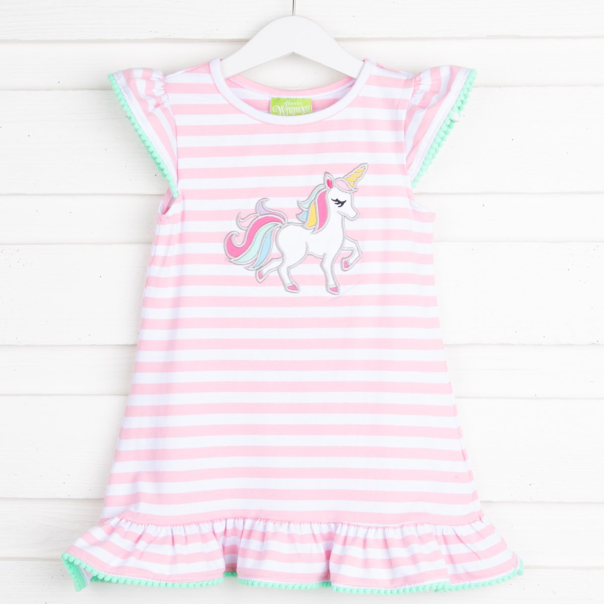 Pretty pink stripe knit ruffle dress! Features unicorn applique and mint mini pom pom trim. Perfect for all season long!