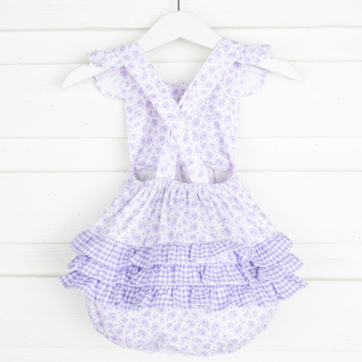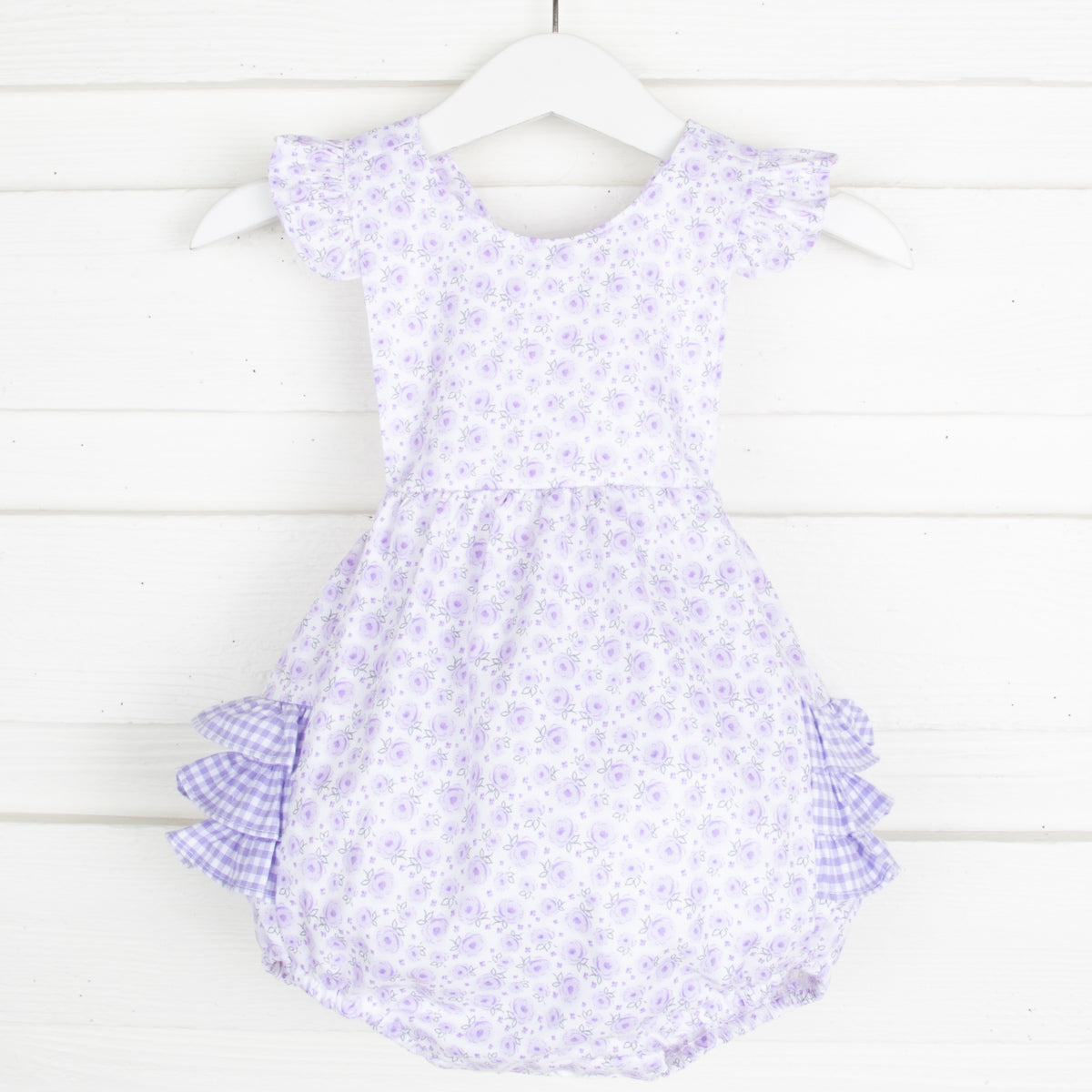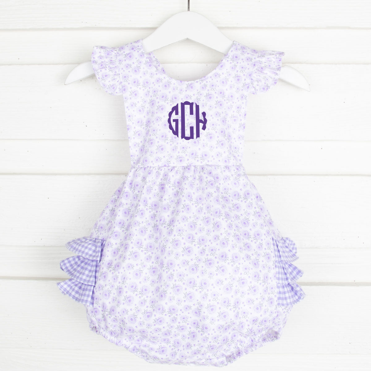 This adorable ruffle bubble in classic purple carolina gingham is ready for a monogram! Features white ruffles and snaps in the stride.