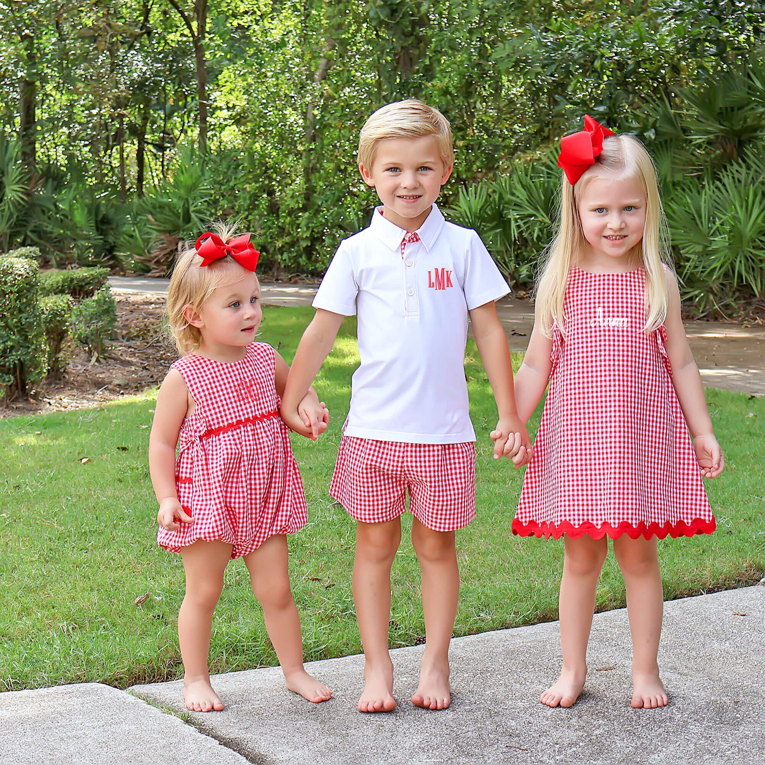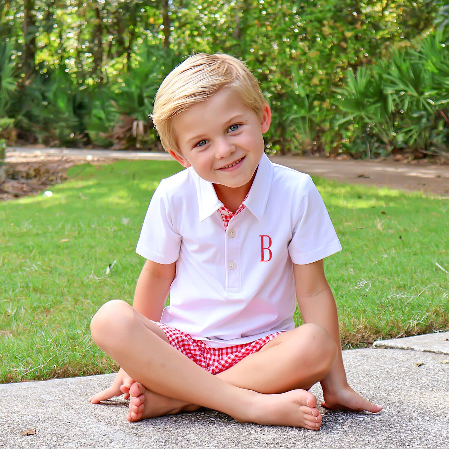 This Red Gingham Boy Polo Short Set is vibrant and perfect for the summer. The white knit polo features a delightful touch of red check on the inner lining tab, enhancing its classic appeal. The set is completed with matching red check shorts. Add a monogram to this polo for a unique and personalized look.