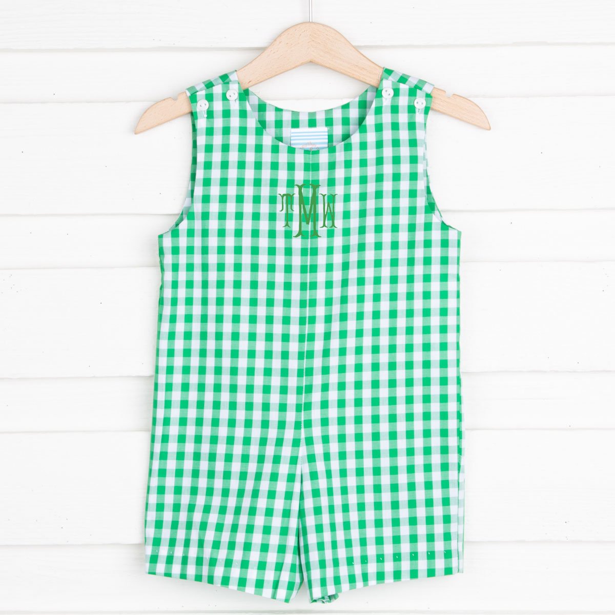Bright green check sleeveless boy romper. Add a monogram! Snaps in stride.