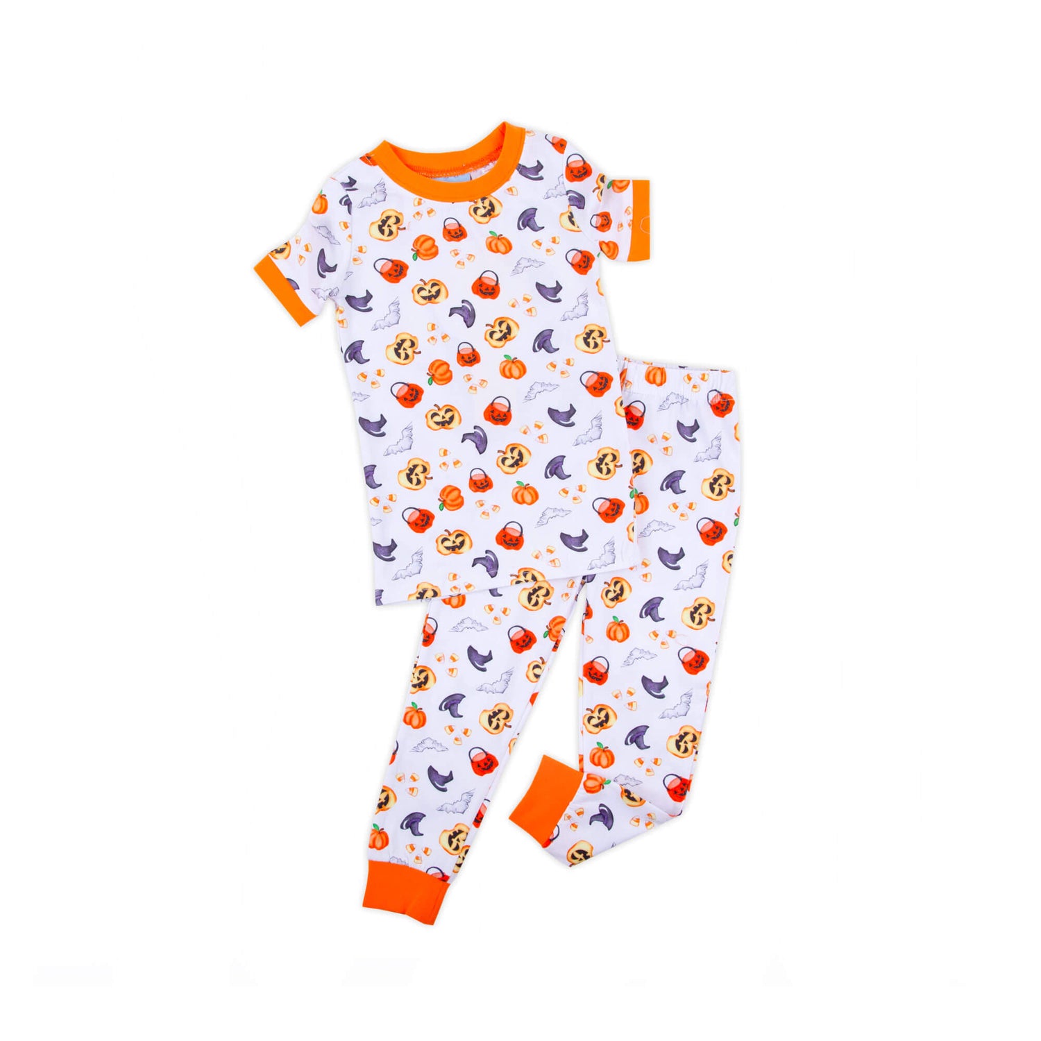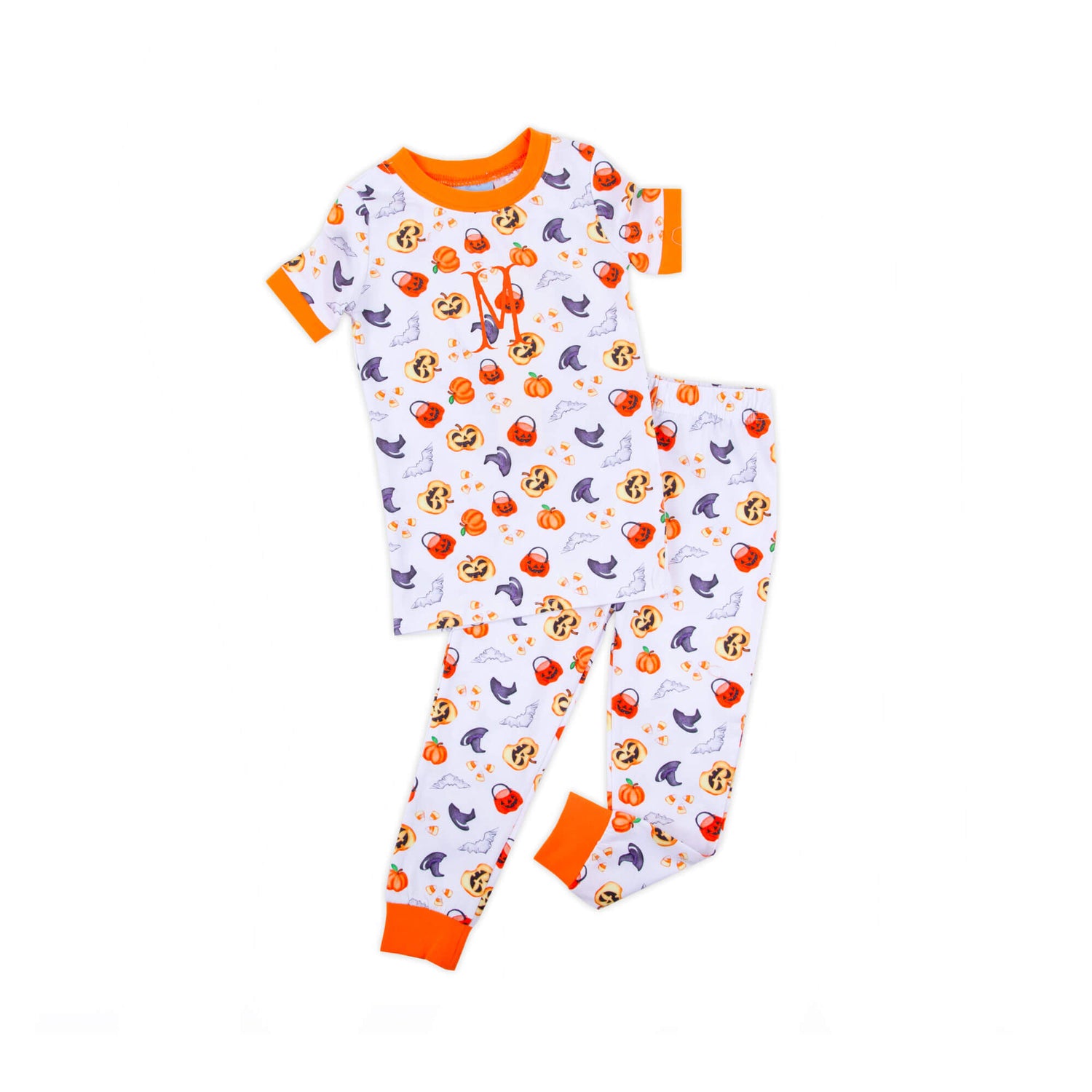 Your little one will enjoy cozy and comfortable nights in our Halloween Print Orange Trim Pajamas. These charming pajamas feature a spooky but fun Halloween print. The set includes a warm short-sleeve pajama top and matching pull-on pajama pants, providing the perfect combination of comfort and warmth. Personalize these pajamas with a monogram for an adorable touch!