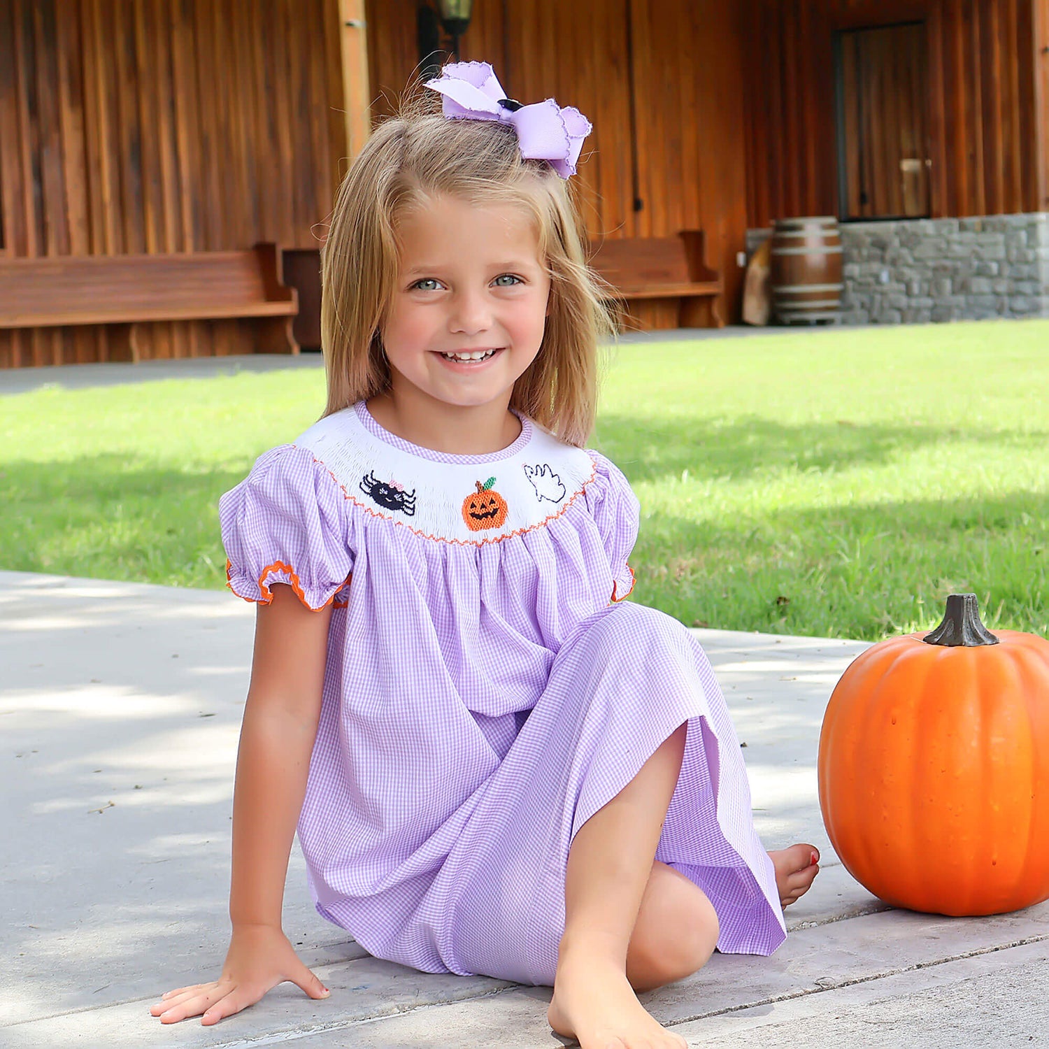 Spooky season isn't complete without our Halloween Smocked Lavender Gingham Dress. This adorable dress features bishop sleeves with orange ric-rac trim and a cute hand-smocked Halloween theme with a spider, jack-o'-lantern, and ghost across the neckline. Perfect for Halloween school parties or trick-or-treating!