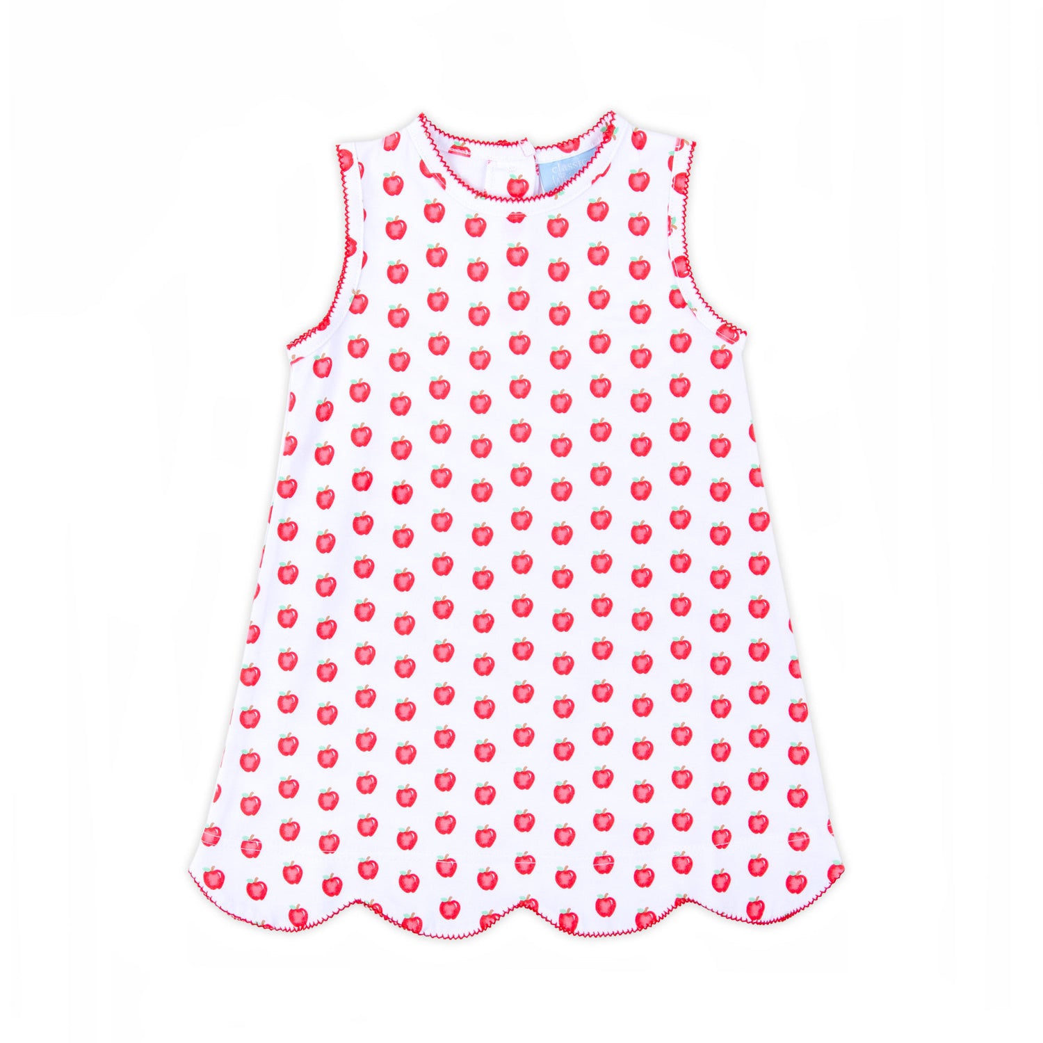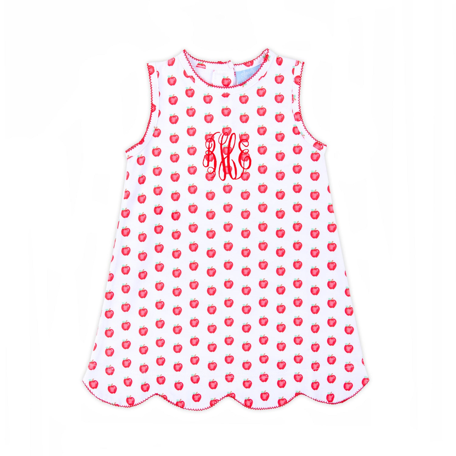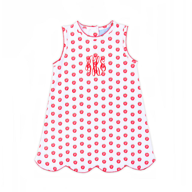 Get ready for back to school with the adorable Apple a Day Dress. This sleeveless dress features a soft knit charming apple print and a scalloped hem with red picot trim. Add a monogram to personalize the look.