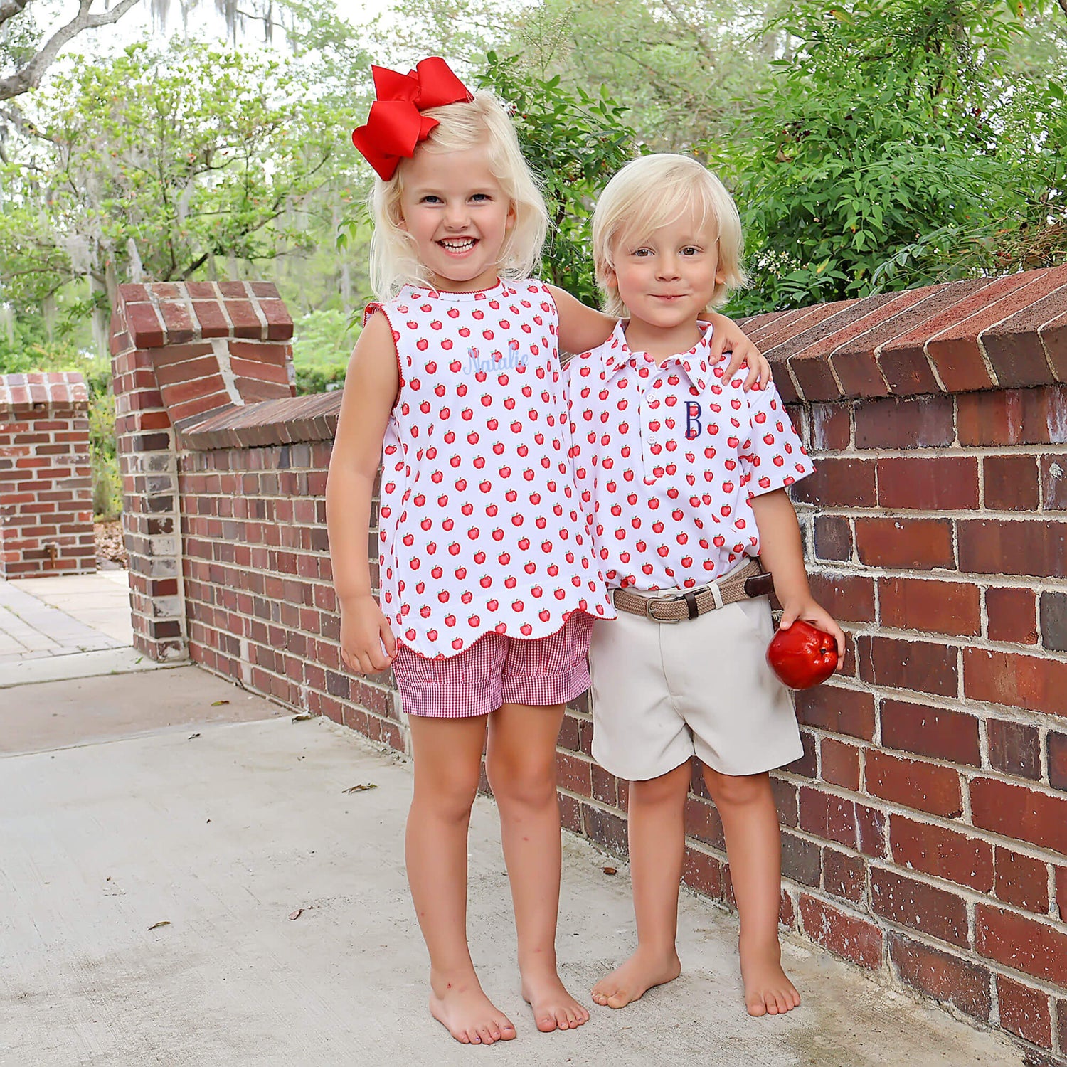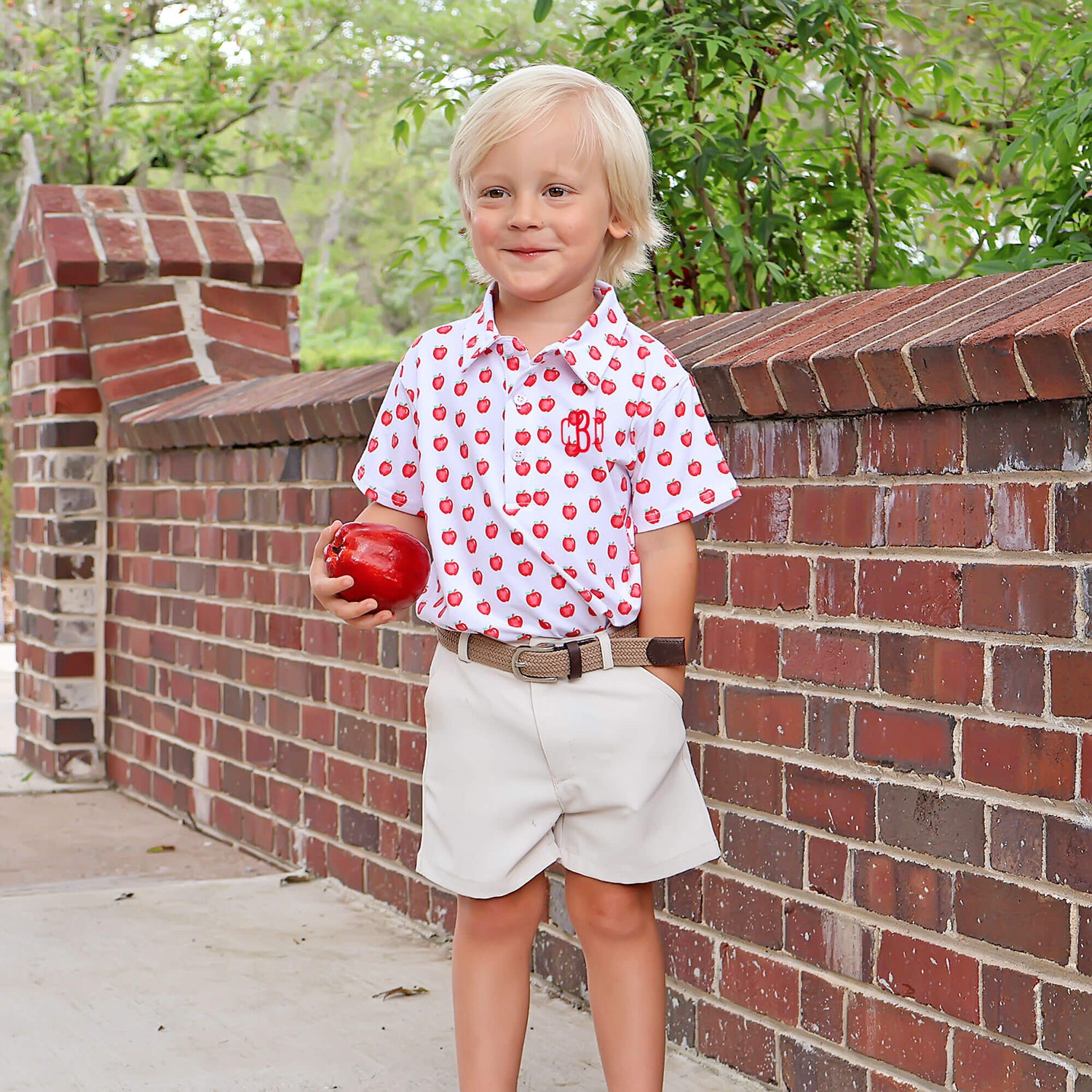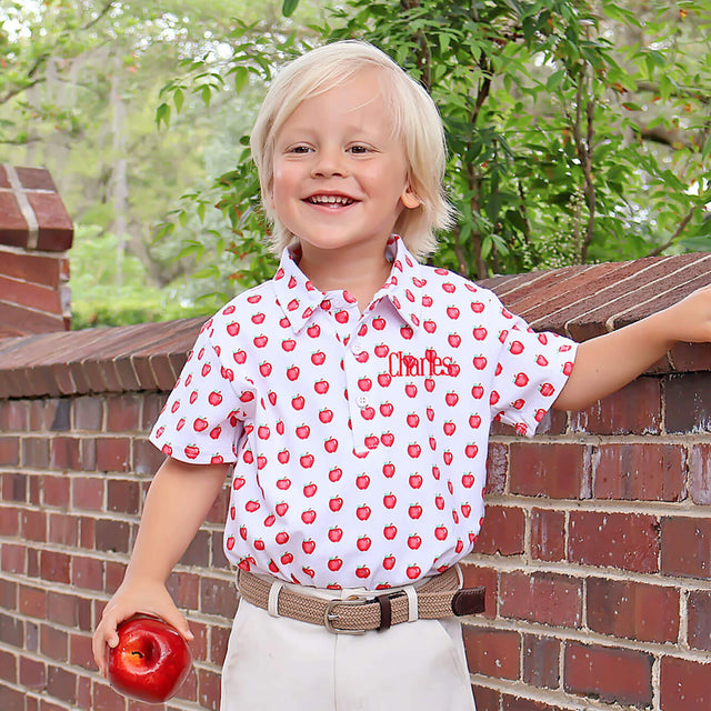 This Apple a Day Polo will become your favorite piece to mix and match for school days, and it's perfect for playtime too. The white polo features the cutest apple print in a soft knit. Add a name monogram for a personalized touch!