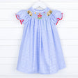 This A+ outfit is a must-have! Our light blue gingham check dress features charming hand-smocked school themes like a schoolhouse and school buses. Adorable bishop sleeves with red ric-rac trim complete the look, making it the best outfit for the first day of school!