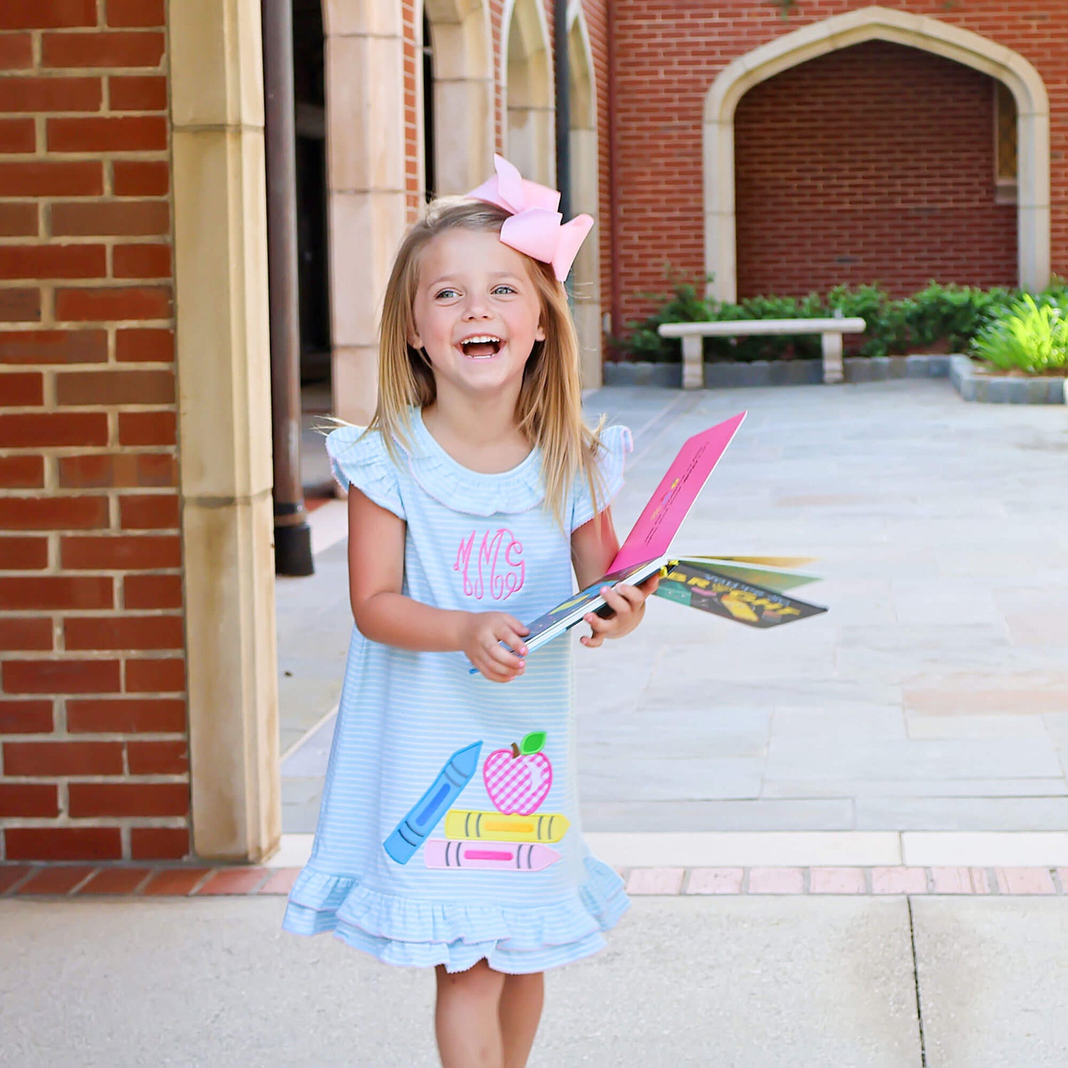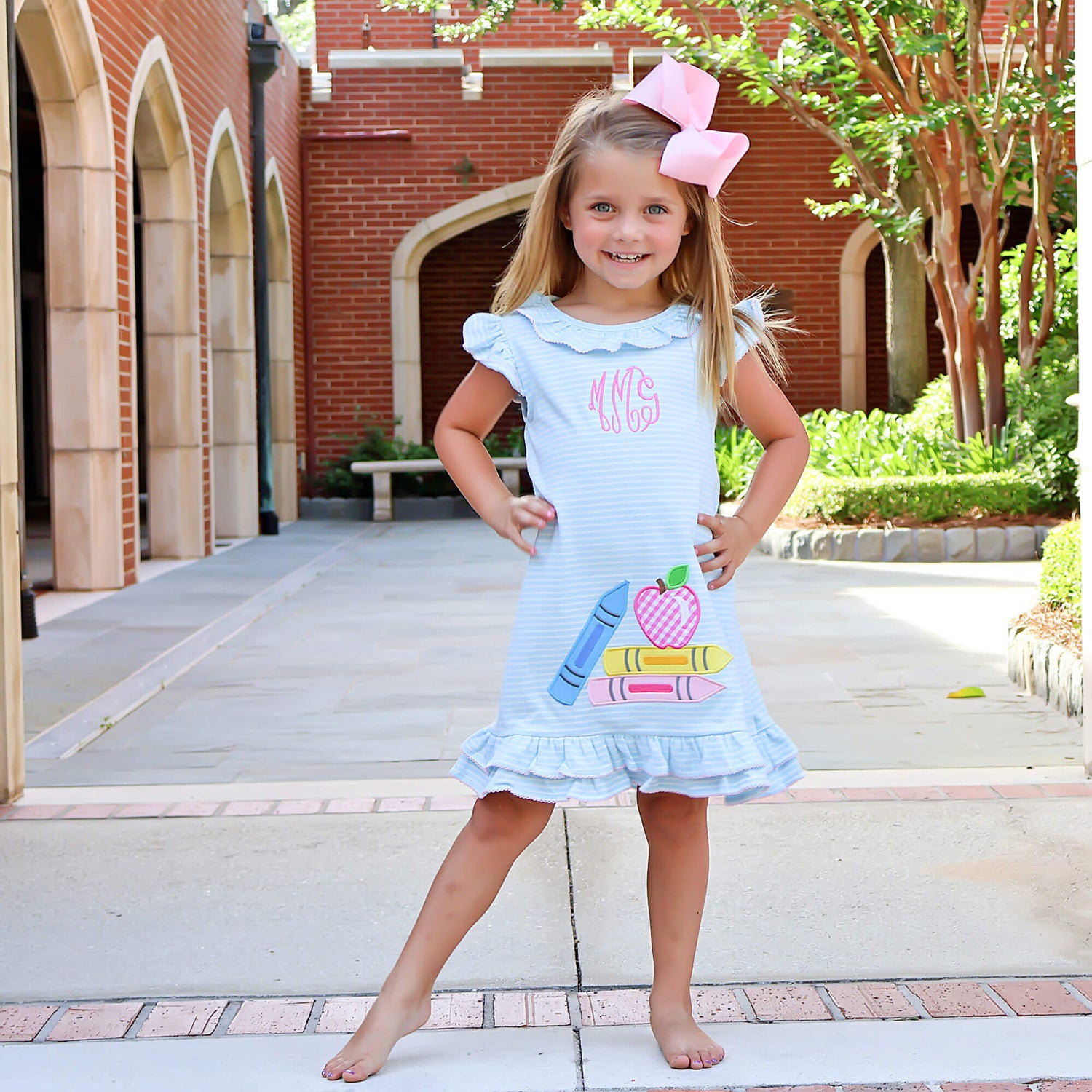 The Bright Crayons Light Blue Stripe Milly Dress is perfect for back-to-school and playtime! This striped soft knit Milly-style dress features a colorful crayon and apple applique, an adorable ruffle collar, and flutter sleeves with pink picot trim. Add a monogram for a personalized touch!