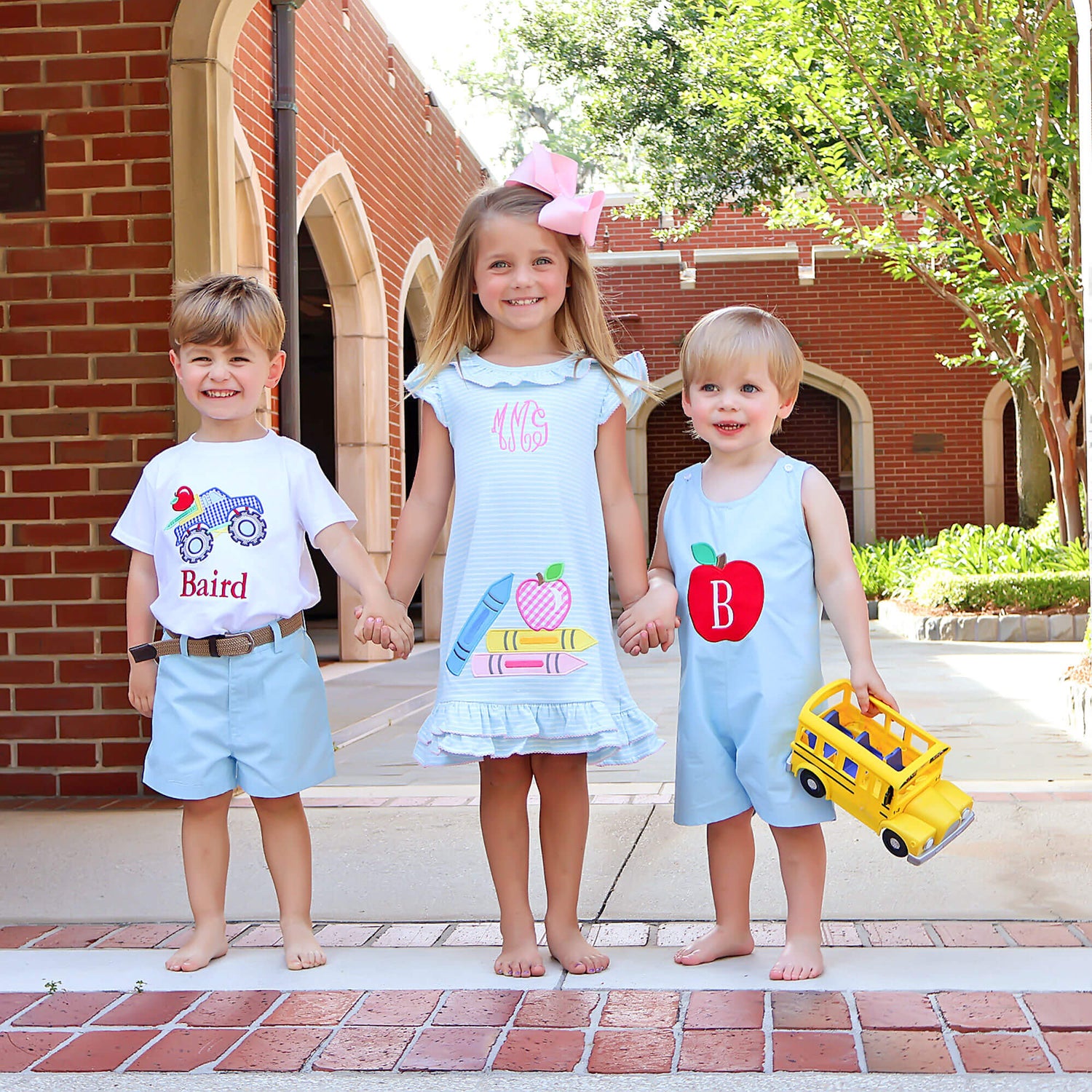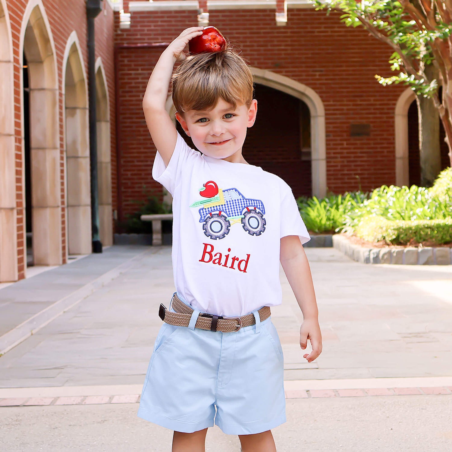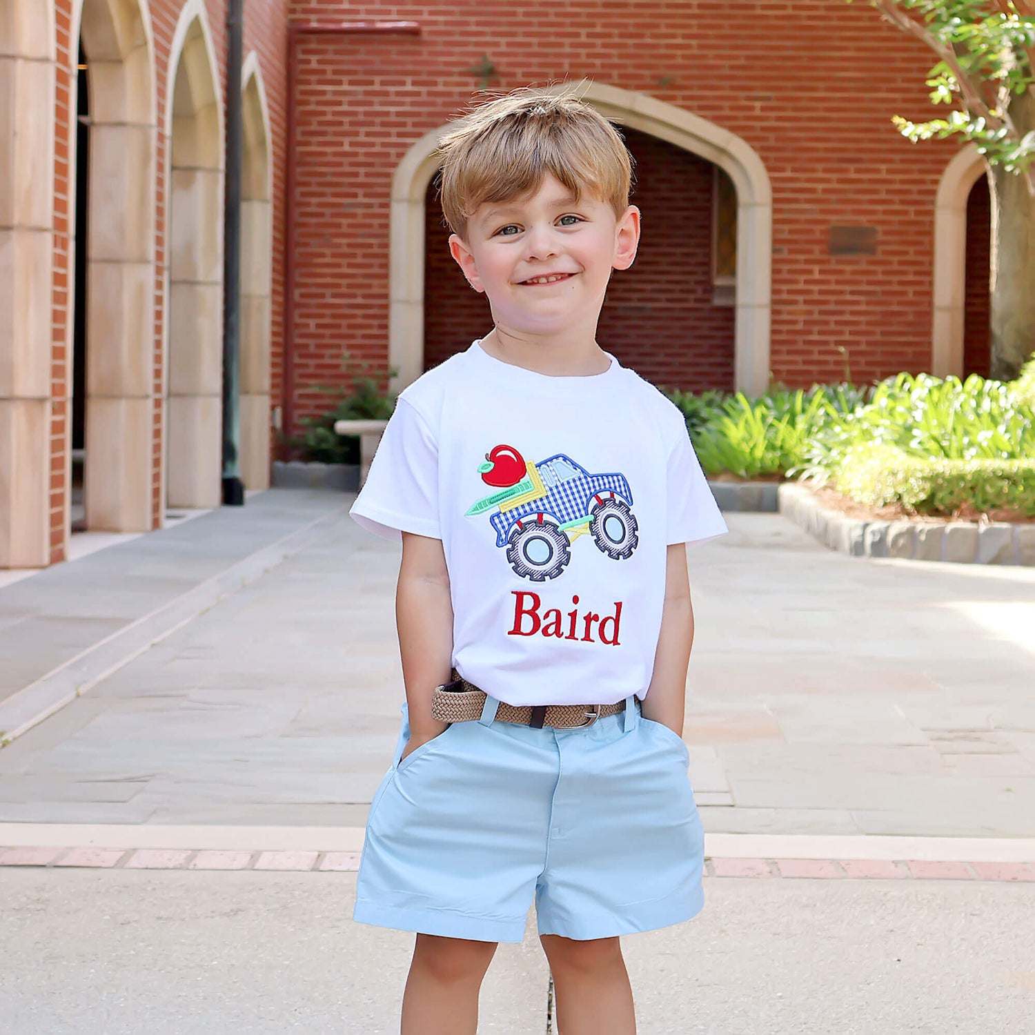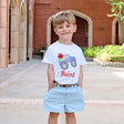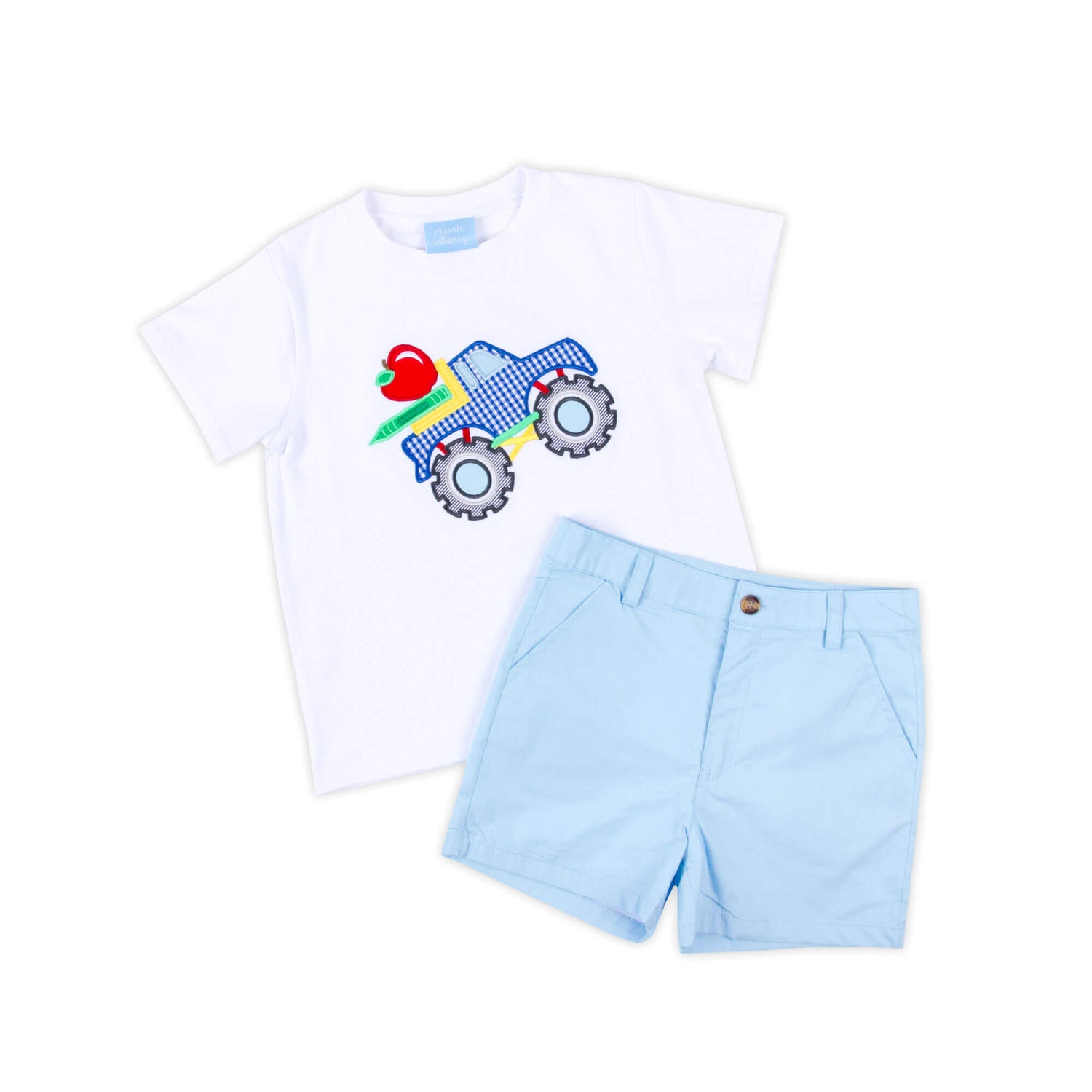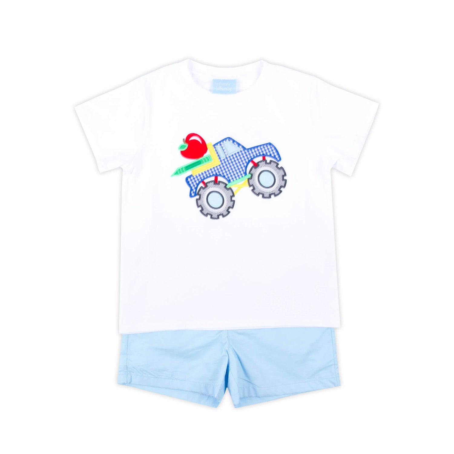 The Bright Crayons Truck Light Blue Short Set is perfect for back-to-school and playtime! The white soft knit shirt features a cool applique of a monster truck loaded with school supplies. Paired with light blue Standard Shorts, this set is both charming and practical. Add a monogram for a personalized touch!
