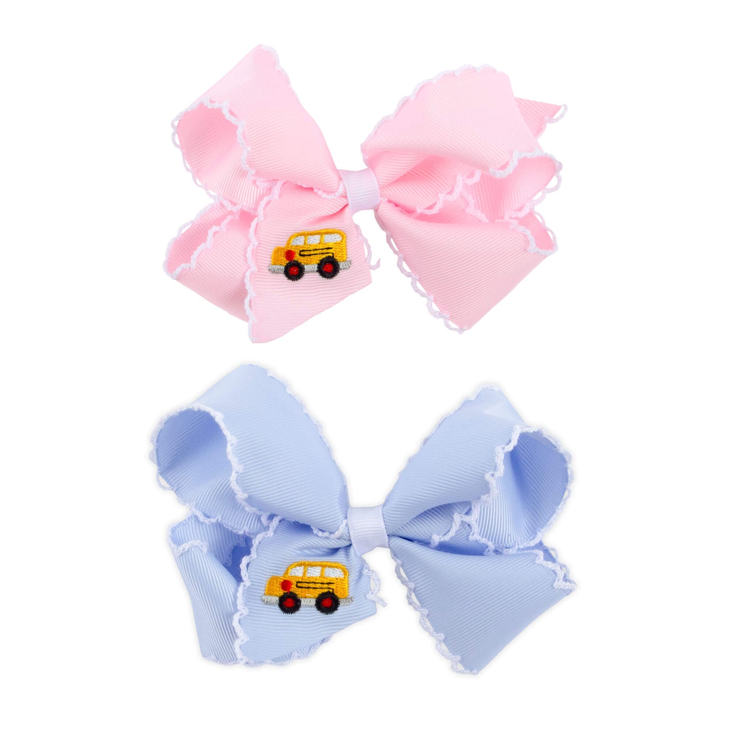 his grosgrain hair bow is perfect for little girls headed back to school. It features a beautiful moonstitch edge and comes in your choice of blue or pink, each with an adorable school bus embroidery that adds a sweet touch to any outfit.