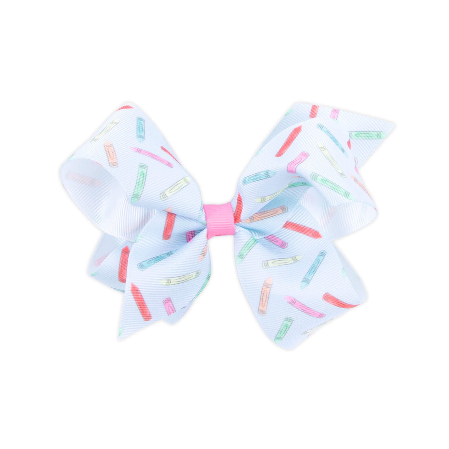 This grosgrain hair bow is perfect for little girls heading back to school. It features a colorful crayon print that adds a sweet touch to any outfit.