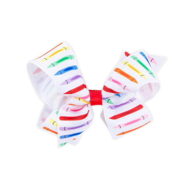 This grosgrain hair bow is perfect for little girls heading back to school. It features an adorable crayon print that adds a sweet touch to any outfit.
