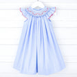 This Patriotic Geo Smocked Blue Gingham Dress is the perfect patriotic outfit for watching fireworks and enjoying a 4th of July cookout. Designed from light blue gingham fabric, this dress features charming red and white geometric smocking and angel-style sleeves adorned with red picot trim.