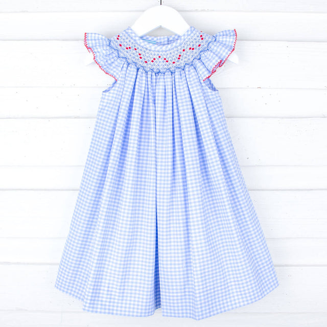 Patriotic Blue Gingham Geo Smocked Angel Sleeve Dress