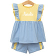 The Rosie Cornflower and Yellow Short Set is perfect for any occasion! The cornflower and yellow knit top features a playful waterfall ruffle detail, paired with coordinating cornflower shorts for a sweet look that's ready for playtime fun. Add a monogram to personalize this adorable outfit!