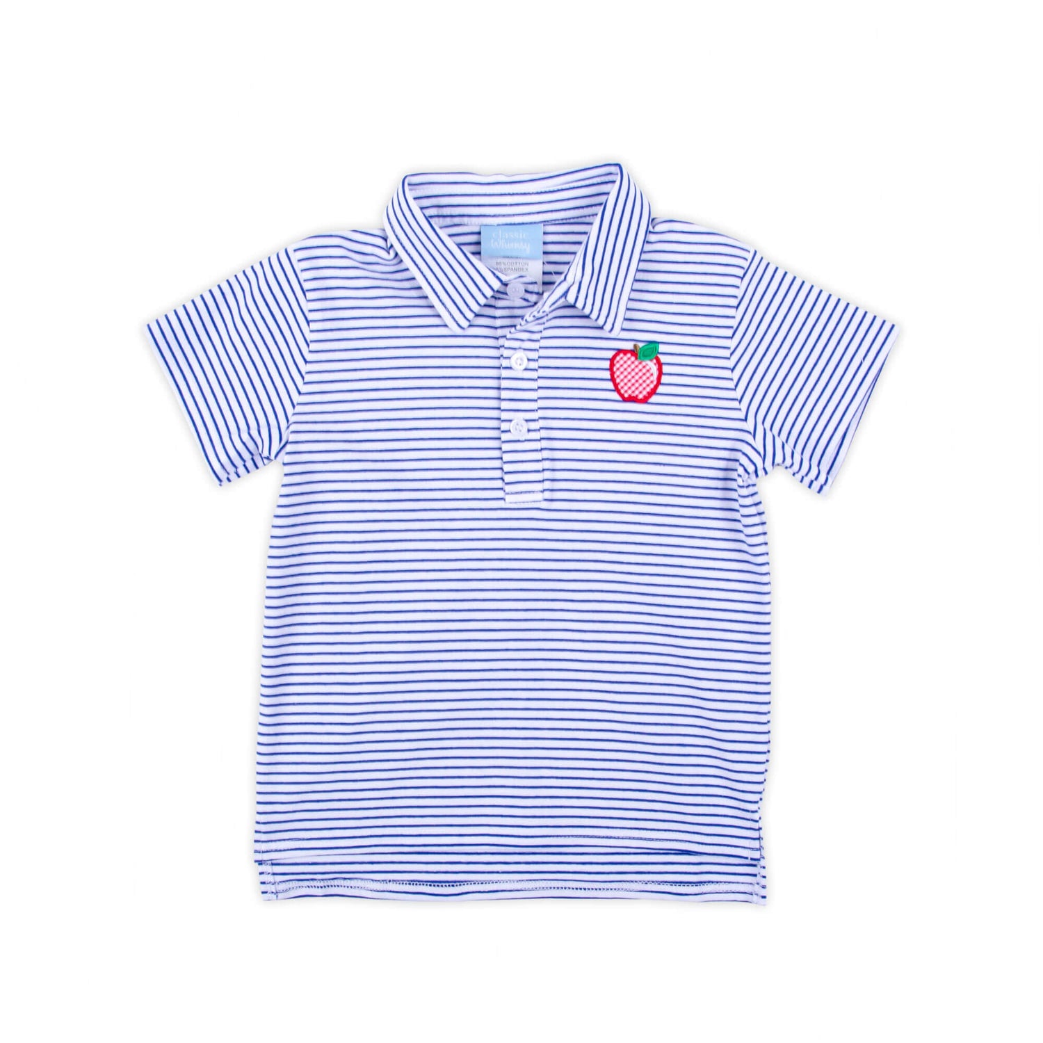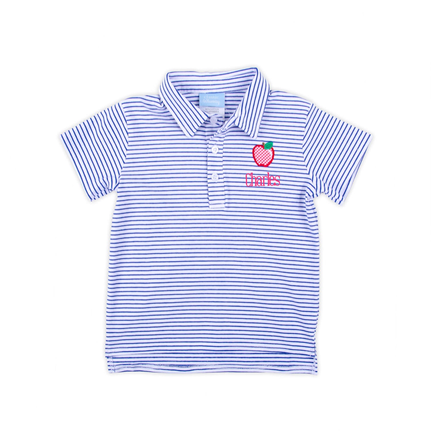 Start the school year in style with our Good Apple Royal Stripe Apple Polo Shirt! This classic royal blue stripe soft knit polo features a red gingham apple applique on the side, making it easy to mix and match with your favorite bottoms. Add a monogram below the apple for a personalized touch!