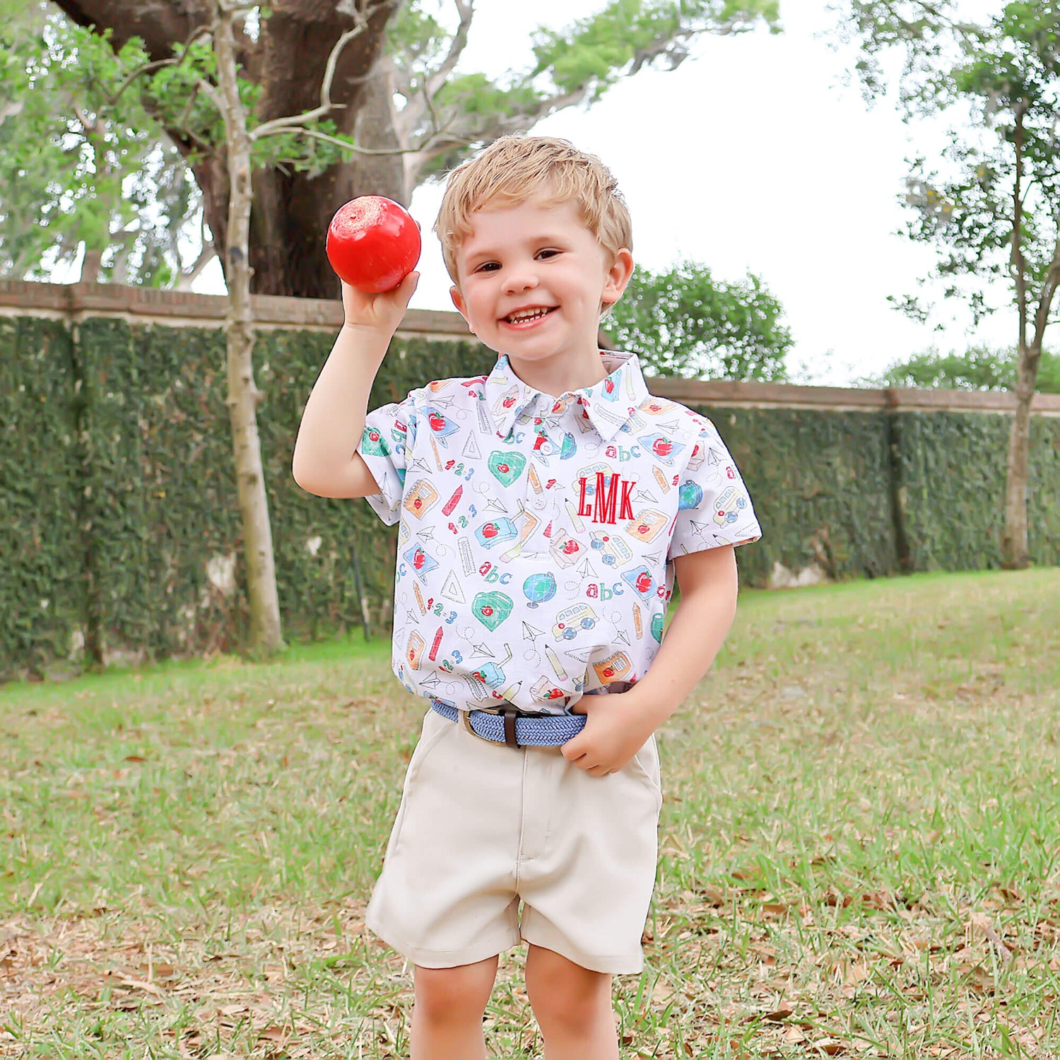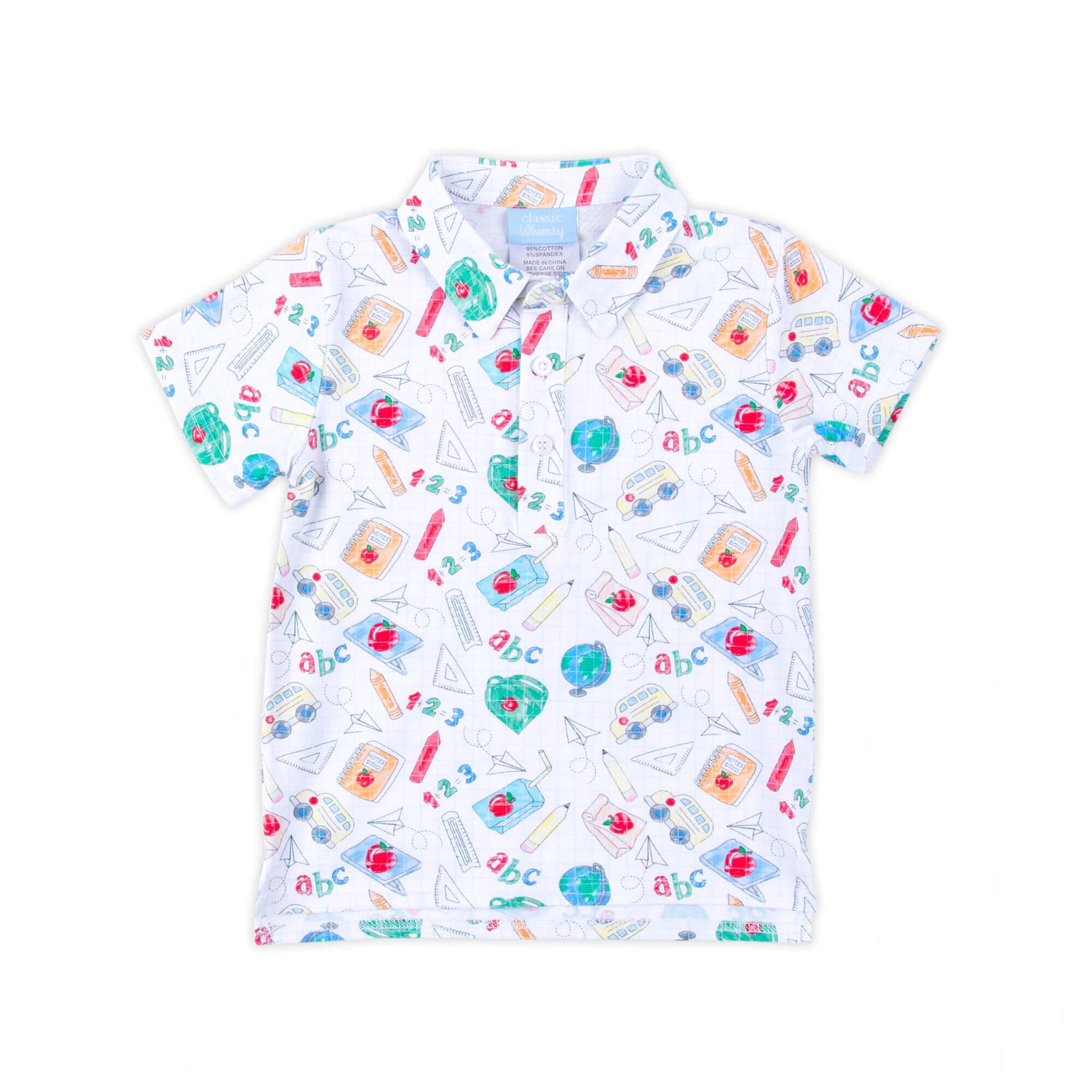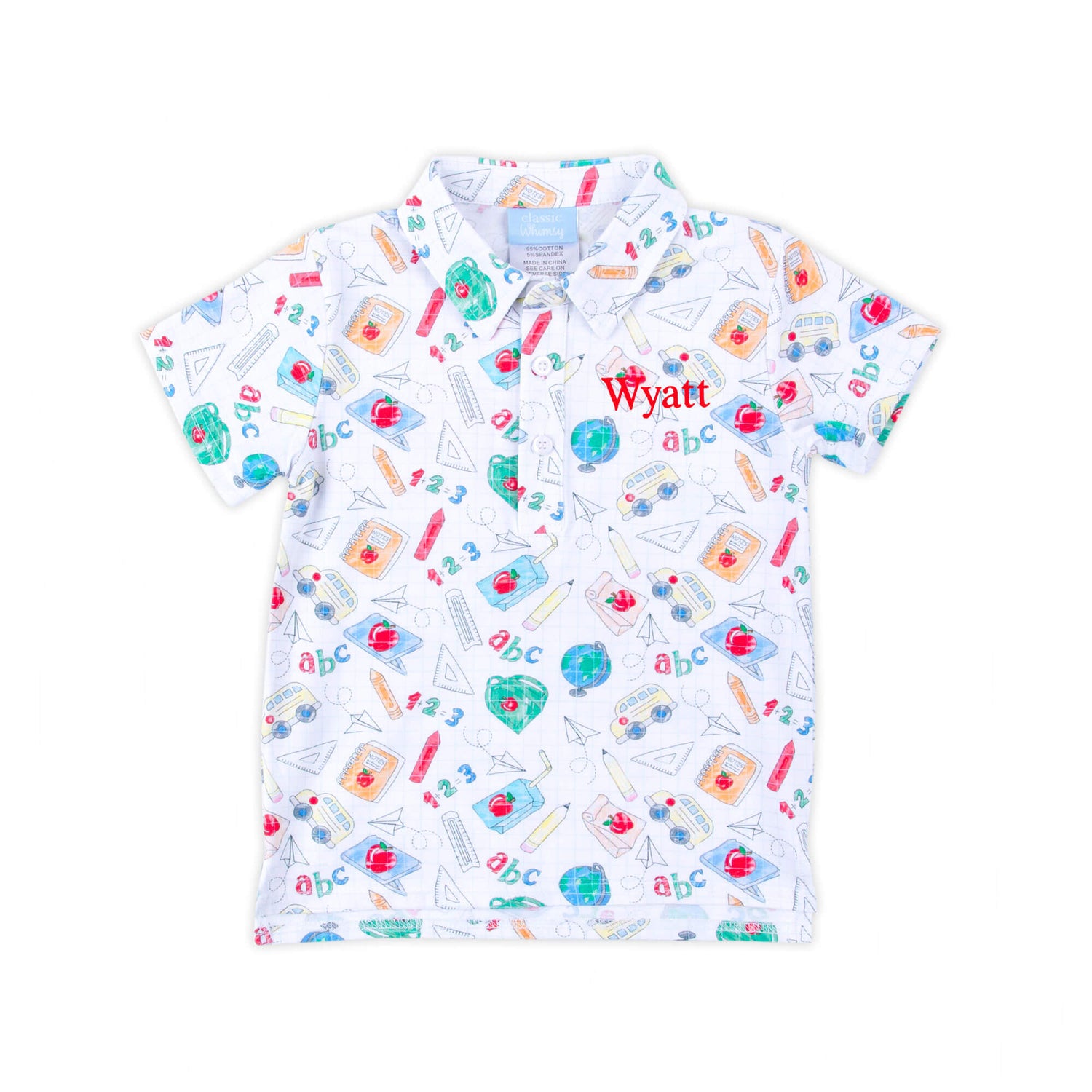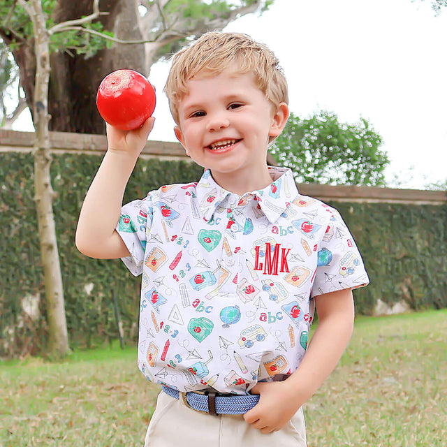 It's back to school time and your little one will be ready to start with this wonderful Scholastic Doodle Polo. This soft knit polo features a fun school print. It’s sure to be one of their favorites, and can be easily mixed and matched with one of our standard shorts or pants. Add a monogram to make it uniquely theirs!