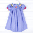 This School Bus Smocked Royal Gingham Bishop Dress is ideal for back-to-school and playtime. The royal blue gingham dress features charming smocking with a schoolhouse and school bus. With bishop-style sleeves adorned with red ric-rac trim, it adds a delightful touch, creating an adorable outfit perfect for school.