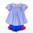 This School Bus Smocked Royal Gingham Bishop Short Set is ideal for back-to-school and playtime. The royal blue gingham top features charming smocking with a schoolhouse and school bus. With bishop-style sleeves adorned with red ric-rac trim, it adds a delightful touch. Finish off the look with royal blue shorts adorned with red bows, creating an adorable outfit perfect for school.