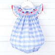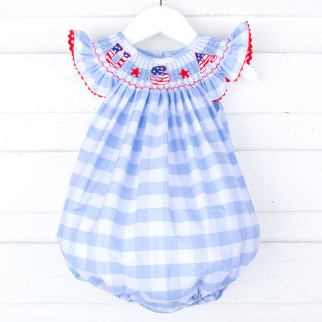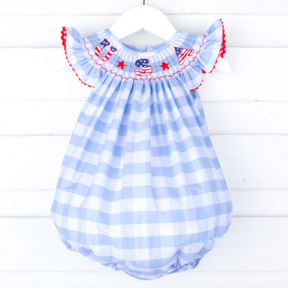 Include our USA Smocked Blue Check Angel Sleeve Bubble in your patriotic celebration! This charming blue check bubble features smocked "USA" across the neckline, adding a festive touch. With angel-style sleeves for added flair and comfort, it's perfect for your little one. Snaps in stride make dressing a breeze. It's the perfect outfit to celebrate the 4th of July or the upcoming Summer Olympics in style.