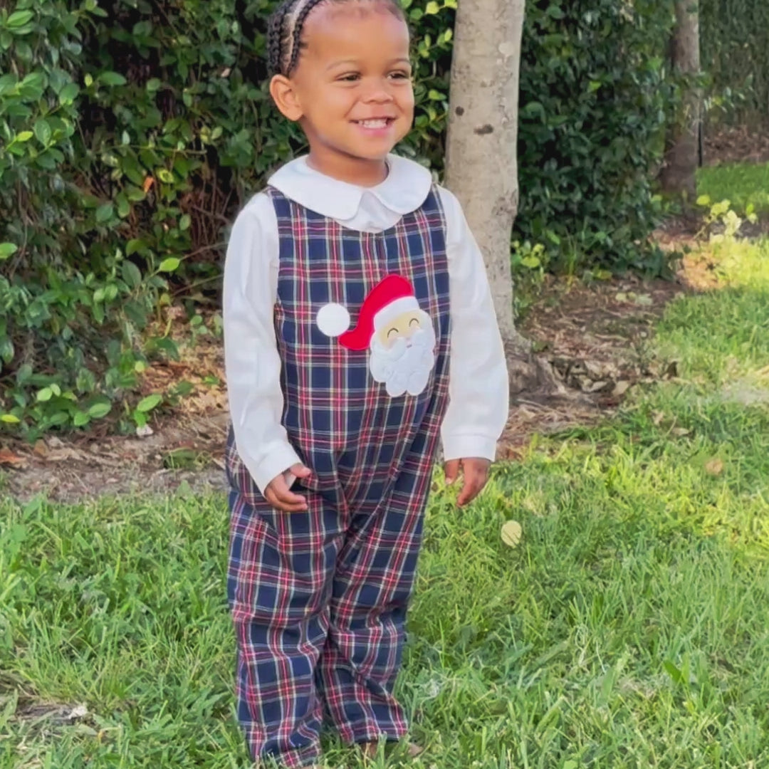 Celebrate the holidays in style with our enchanting Happy Santa Royal Plaid Longall! This festive royal plaid longall features our iconic Happy Santa applique for a touch of holiday magic. Shoulder buttons and snaps at the stride make changes easier. Add a monogram to personalize this outfit, making it truly special for creating cherished holiday memories.