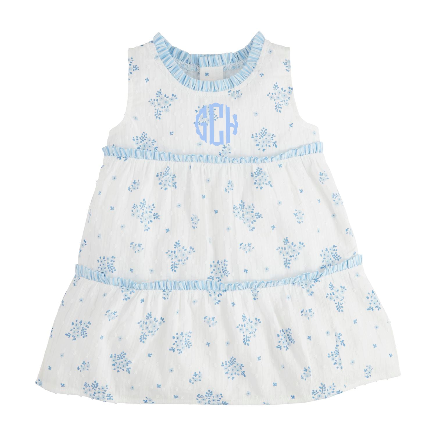 The Blue Floral Tiered Toddler Dress is a charming and stylish choice for your little one. This woven dobby dress showcases a delightful floral pattern, adding a touch of whimsy to any occasion. The tiered design creates a playful silhouette, while the contrast stripe ruffles add a fun and fashionable flair. A sweet back bow completes the look, offering an extra element of charm.
