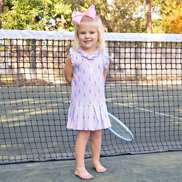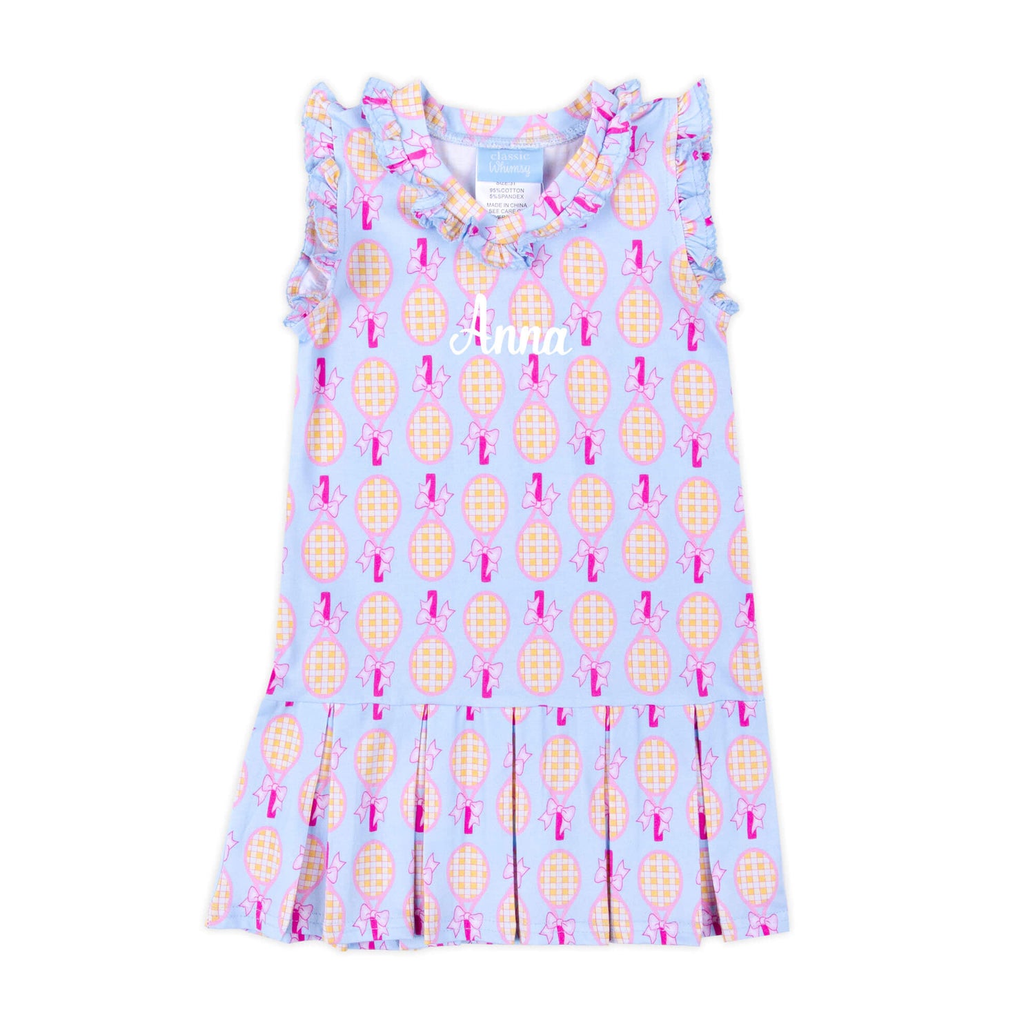 It's tennis time with our adorable Colorful Racquet Tennis Dress! The knit dress features a playful tennis print with ruffle trim, making it perfect for playtime on and off the court. Add a monogram to make it extra special!