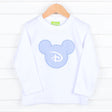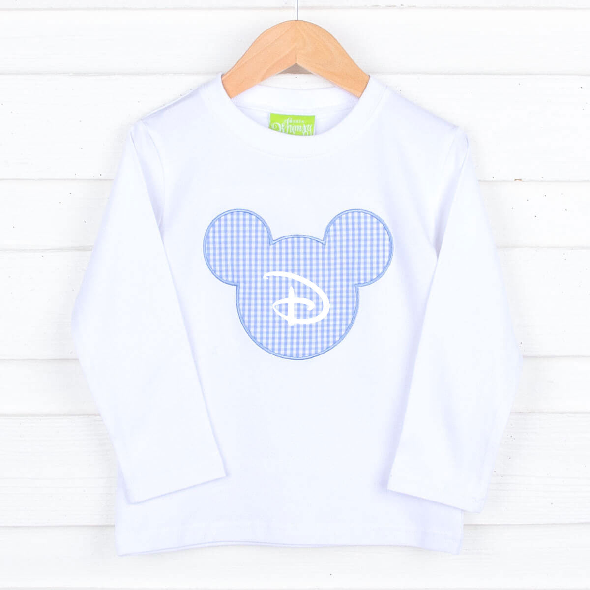 One of our most magical designs! This Light Blue Gingham Mouse Ears Long Sleeve Shirt is great for a trip to your favorite theme park, birthday celebrations, and play time. The white knit shirt features a light blue gingham mouse ears appliqué. Personalize the shirt with a monogram!