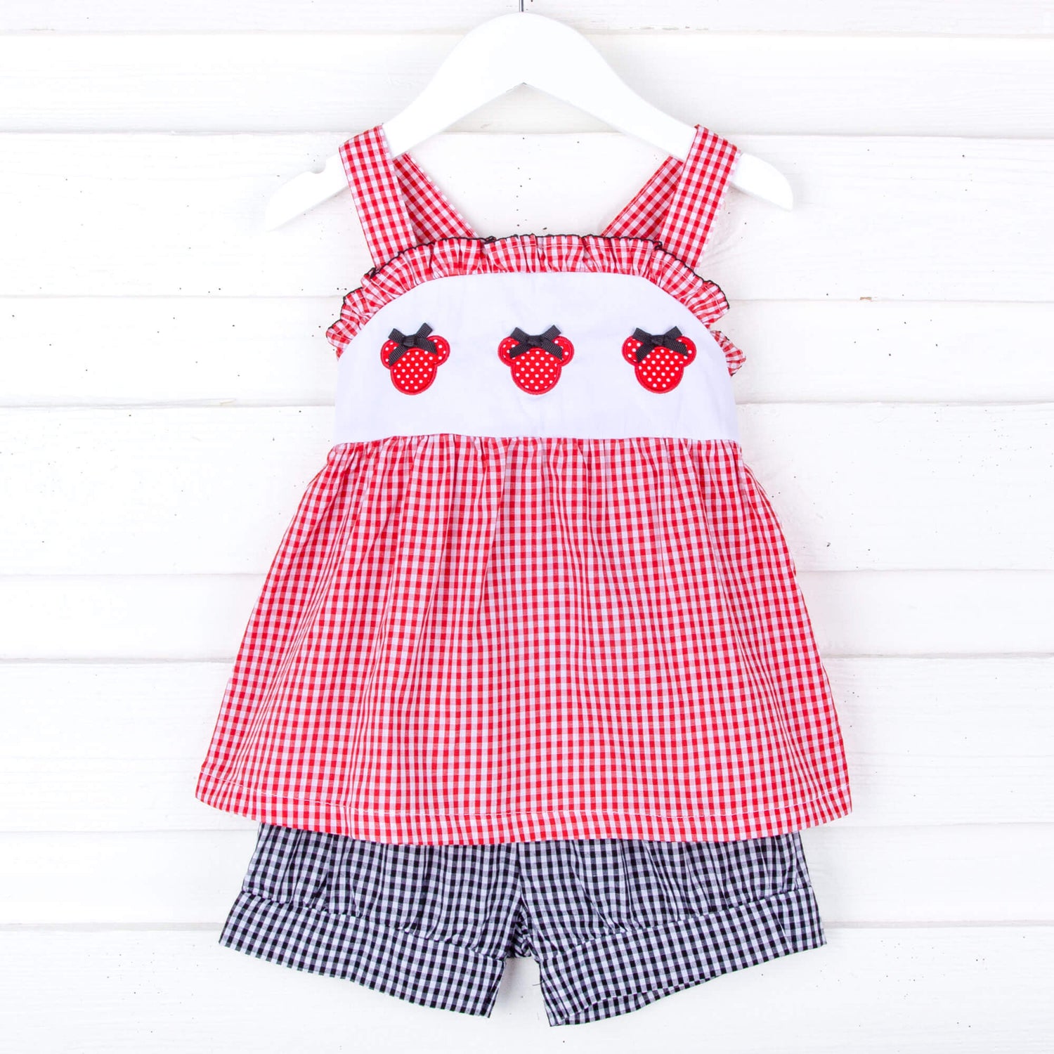 One of our most magical designs! This Mouse Ears Red Gingham Cara Short Set is perfect for theme park adventures, birthday celebrations, and playtime fun. The red gingham Cara top features cross straps, a ruffle hem, and an adorable mouse ears applique with a black bow. Paired with coordinating black gingham shorts, this set is a charming choice for any special day!