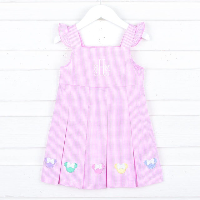 One of our most magical designs! This Pastel Mouse Ears Pink Gingham Chloe Dress is great for a trip to your favorite theme park, birthday celebrations, and play time. The pink Chloe dress features a pleated skirt and flutter sleeves. Also features our favorite colorful pastel mouse ears appliques. Personalize the dress with a monogram!