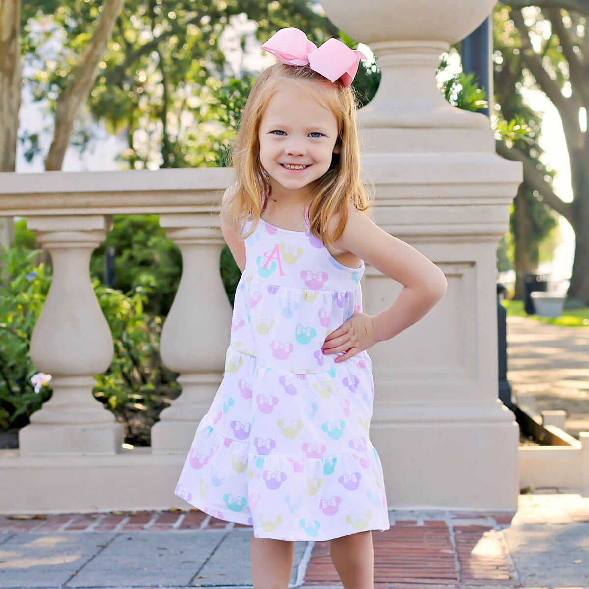 One of our most magical designs! This Pastel Mouse Ears Callie Dress is great for a trip to your favorite theme park, birthday celebrations or just everyday playtime. The tiered Callie dress features cross back straps with ruffle trim. Just as comfy as it is cute, your little girl will love this soft knit fabric in our favorite colorful pastel Mouse Ears print. Personalize this dress with a monogram!