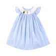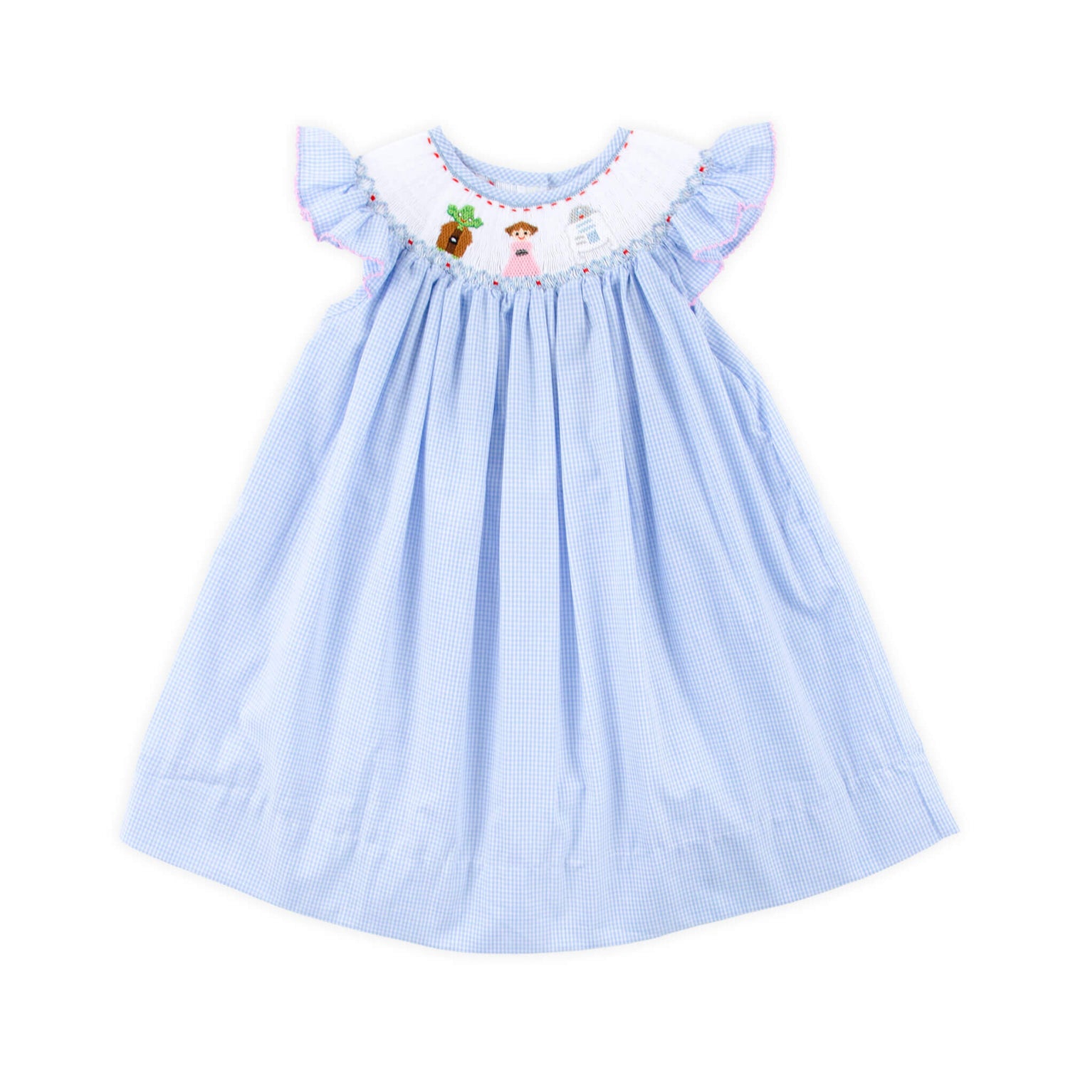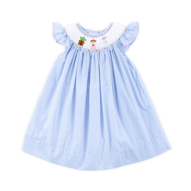 Ideal for playdates, birthdays, or as your next fairytale vacation outfit, this Space Friends Smocked Dress is a charming choice! The blue gingham dress features hand-smocked space friends from a beloved space movie and adorable flutter sleeves with pink picot trim