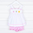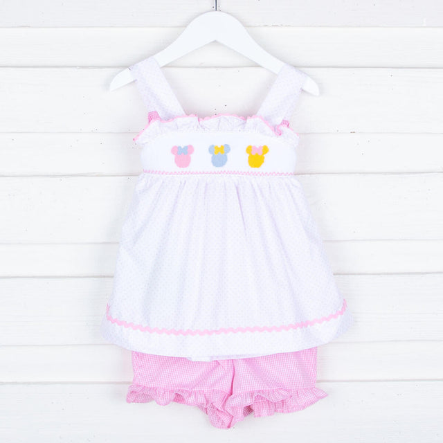 This Sweet Mouse Ears Tie-Back Short Set is a perfect choice for your little one or toddler on your next magical trip! The top features charming pastel rainbow smocked mouse ears and a pink tie-back bow on white and pink polka dot fabric, paired with pink gingham shorts.