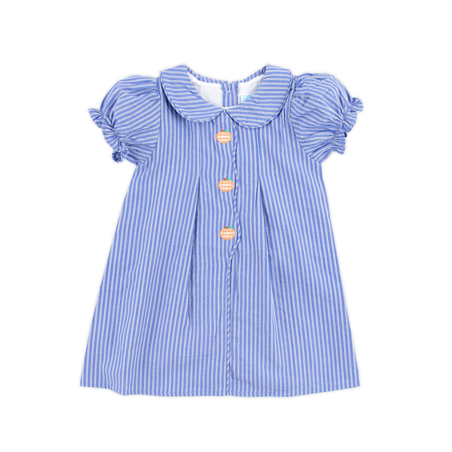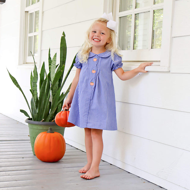 It’s pumpkin season, and your little one will be the cutest at the pumpkin patch in this adorable Pumpkin Blue Stripe Jane Dress! This Jane-style dress features classic blue stripes with sweet mini pumpkin appliqués down the center. An elegant collar, bishop-style sleeves, and delicate pleated details make it a perfect pick for fall festivities!