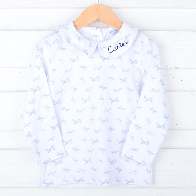 This Airplane Print Undershirt is a sweet choice for any occasion! Whether it’s a day at school, playtime with friends, or a family outing, this piece is perfect for layering. The darling airplane print knit shirt features long sleeves and a sweet collar for a touch of whimsy. Make it even more special by adding a monogram to personalize this delightful undershirt.
