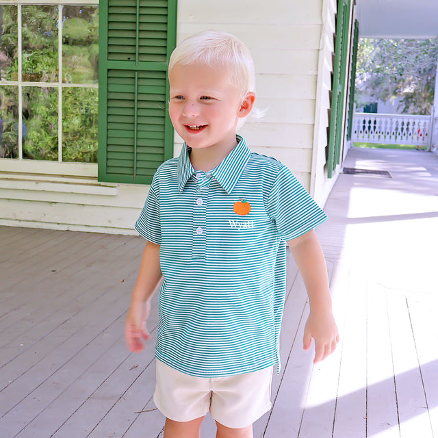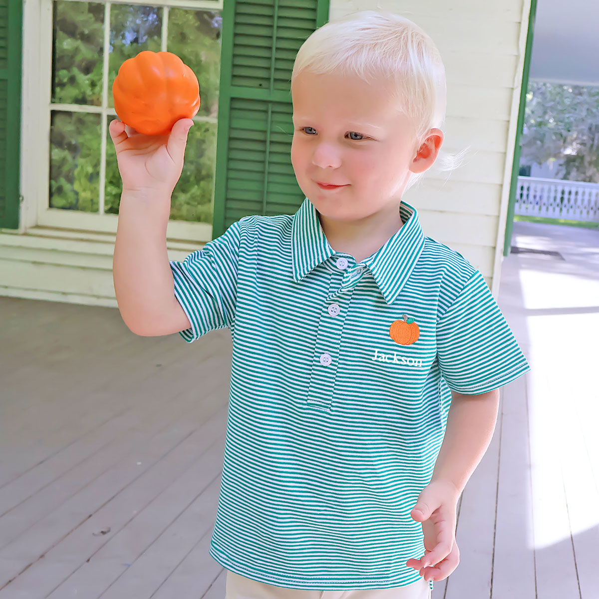 Complement your little one's fall activities with our Pumpkin Embroidered Green Stripe Polo Shirt. This green stripe knit boy's polo features an embroidered pumpkin on the side. Mix and match it with your favorite bottoms. It's perfect for playtime, comfort, and cuteness! Add a monogram name below the pumpkin to finish the look!