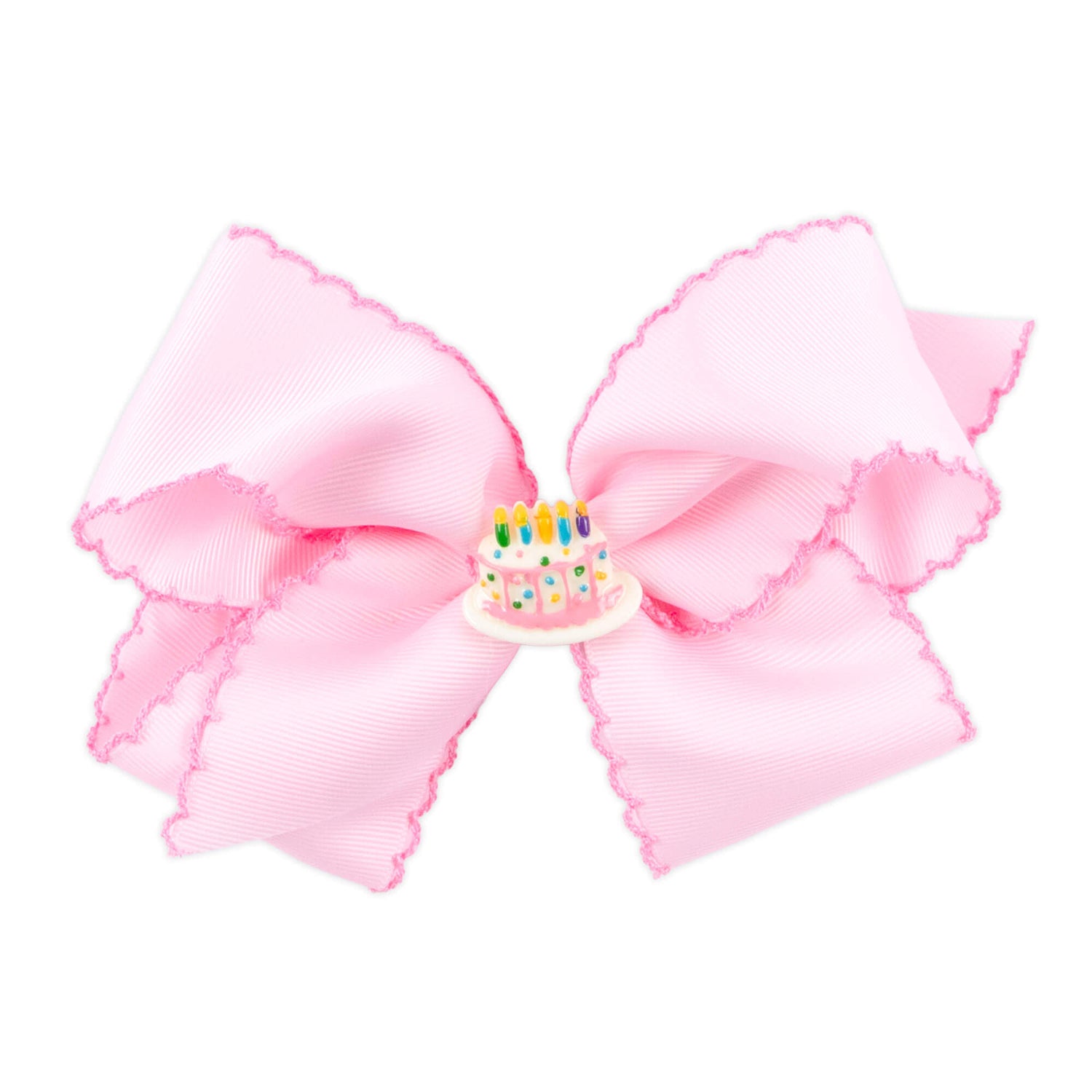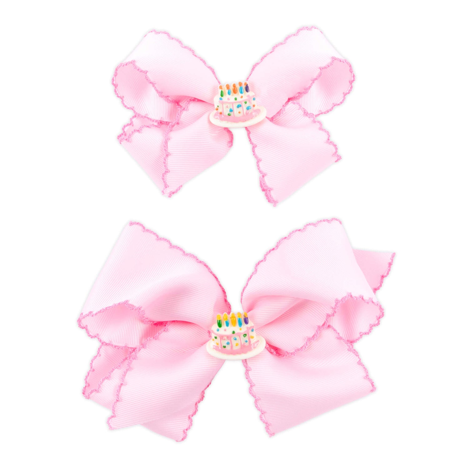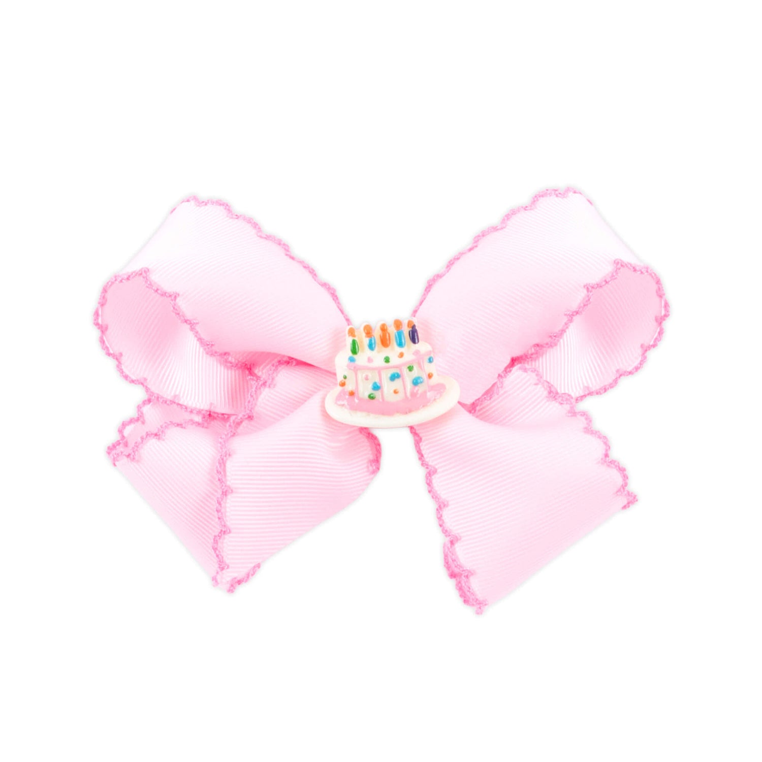 Complete your look with this fun Birthday Cake Charm Moonstitch Hair Bow! You'll be ready for a celebration. Not only does it feature a beautiful moonstitch edge, but it also has a cake charm, adding a sweet touch to your outfit.