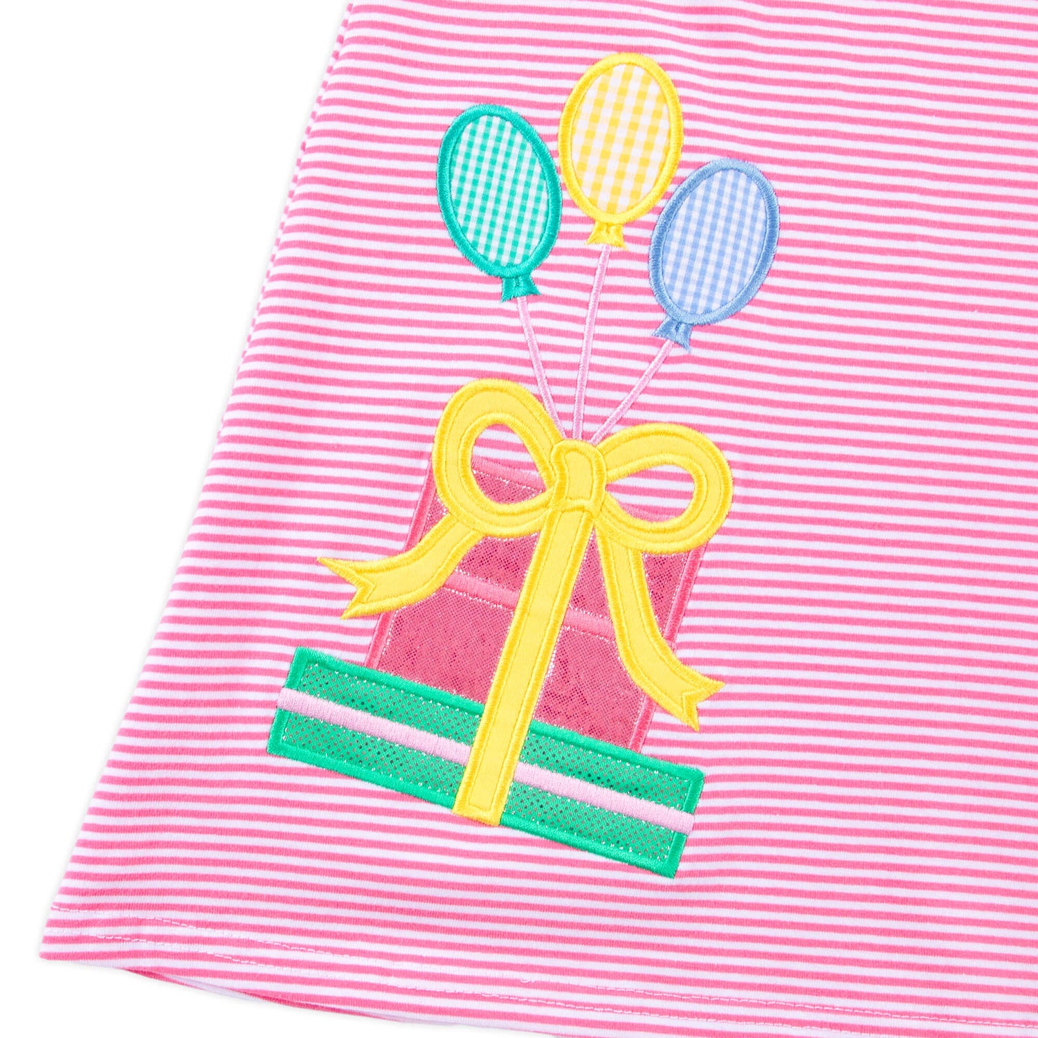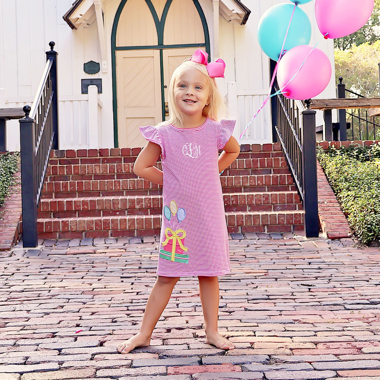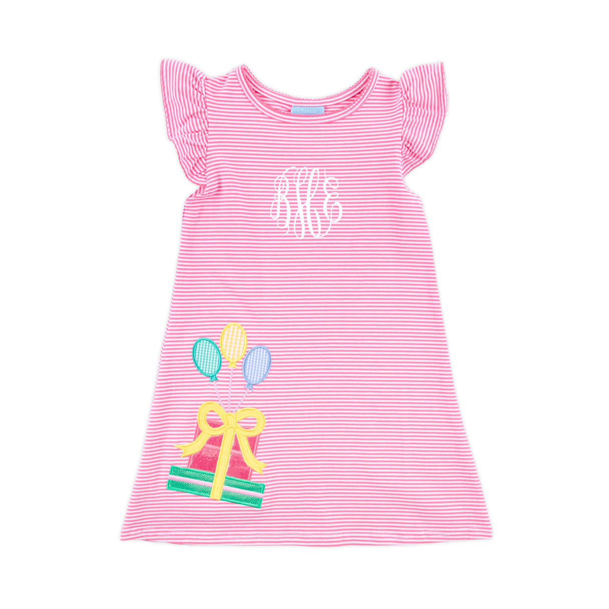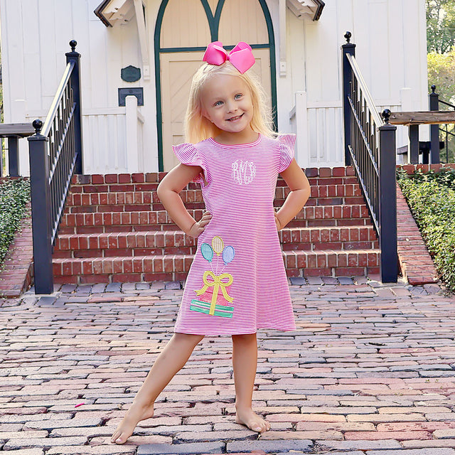 This sweet Birthday Present Pink Stripe Milly Dress is perfect for your little one's Birthday! The pink stripe knit Milly-style dress features adorable birthday presents appliqué and flutter sleeves with pink picot trim, making it a fun choice! Add a monogram for a personalized touch!