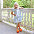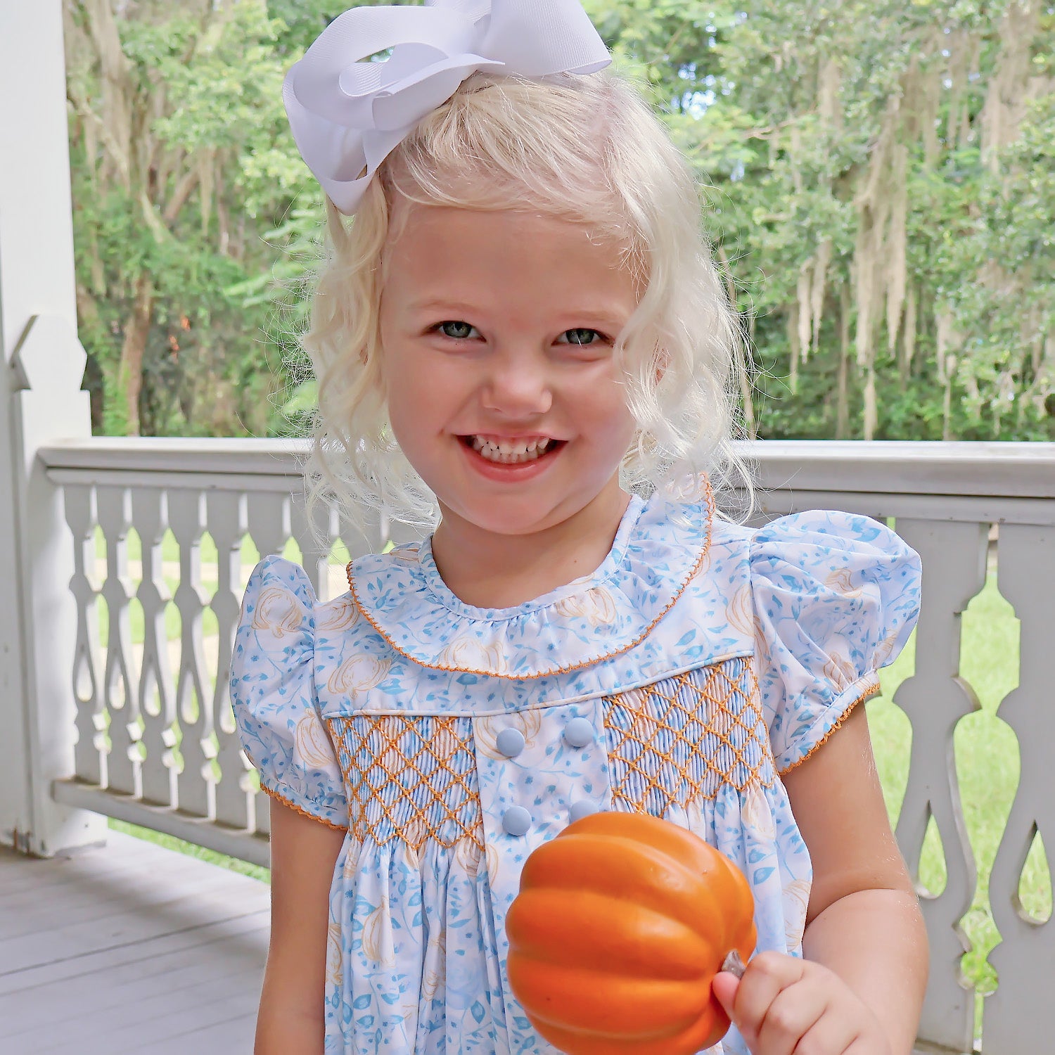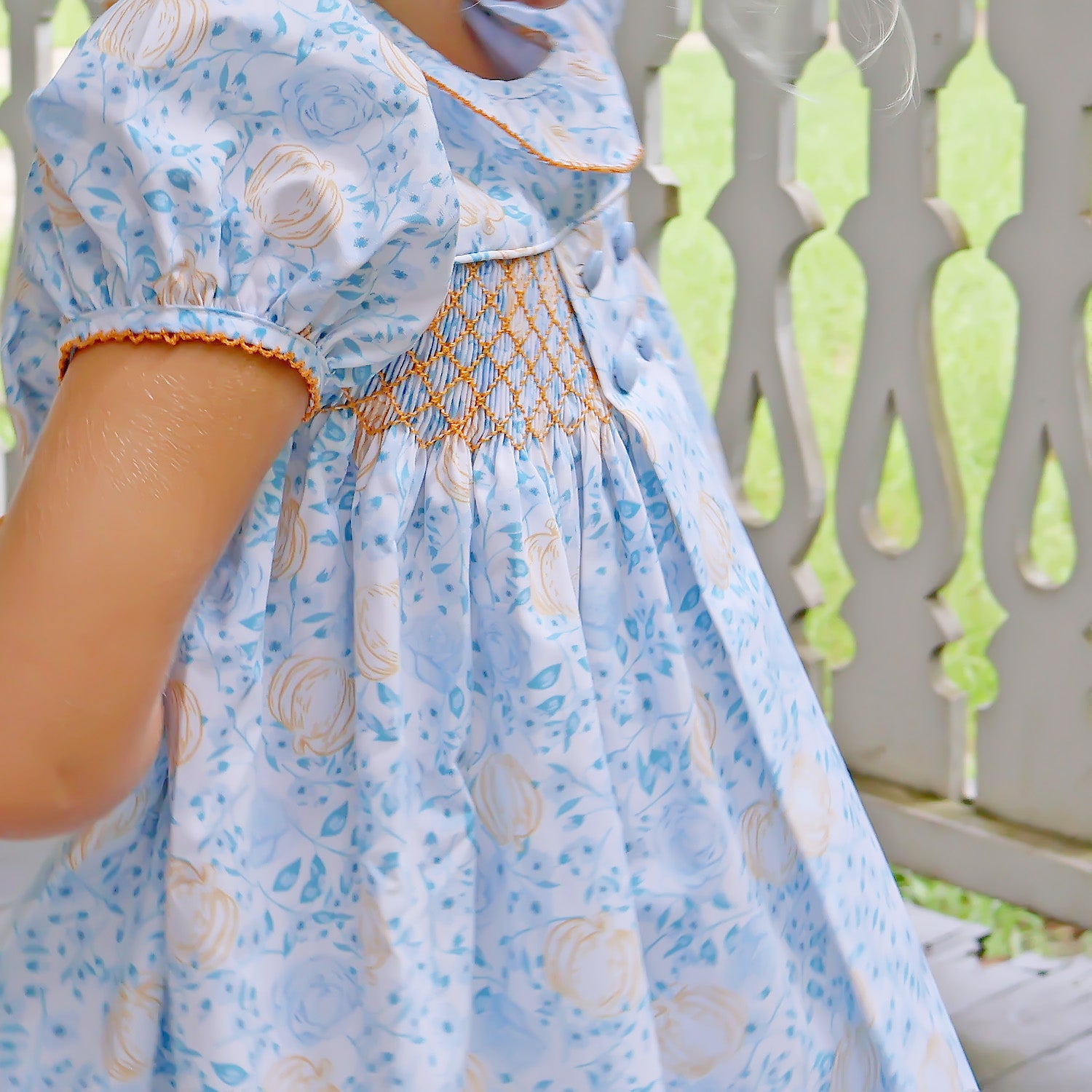 Your little one will look stylish in this Blue Floral Pumpkin Smocked Beth Dress, perfect for any special occasion this fall season. This Beth-style dress features a beautiful blue floral and pumpkin print and geometric smocking for an elegant touch.