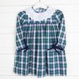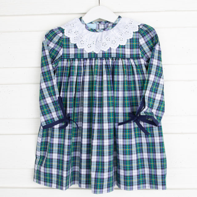 Our Brighton Plaid Virginia Dress is a timeless choice for Fall and Winter! This navy and green plaid dress features long sleeves with charming navy pique ties and an eyelet collar for an extra beautiful touch.