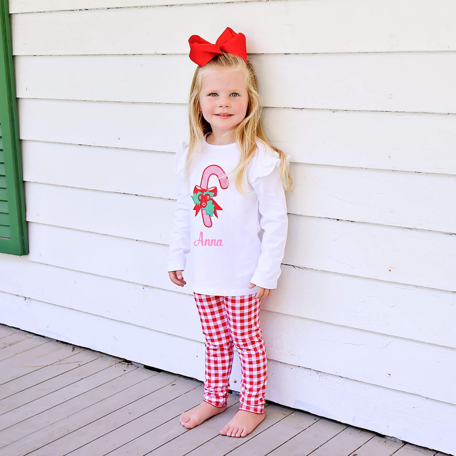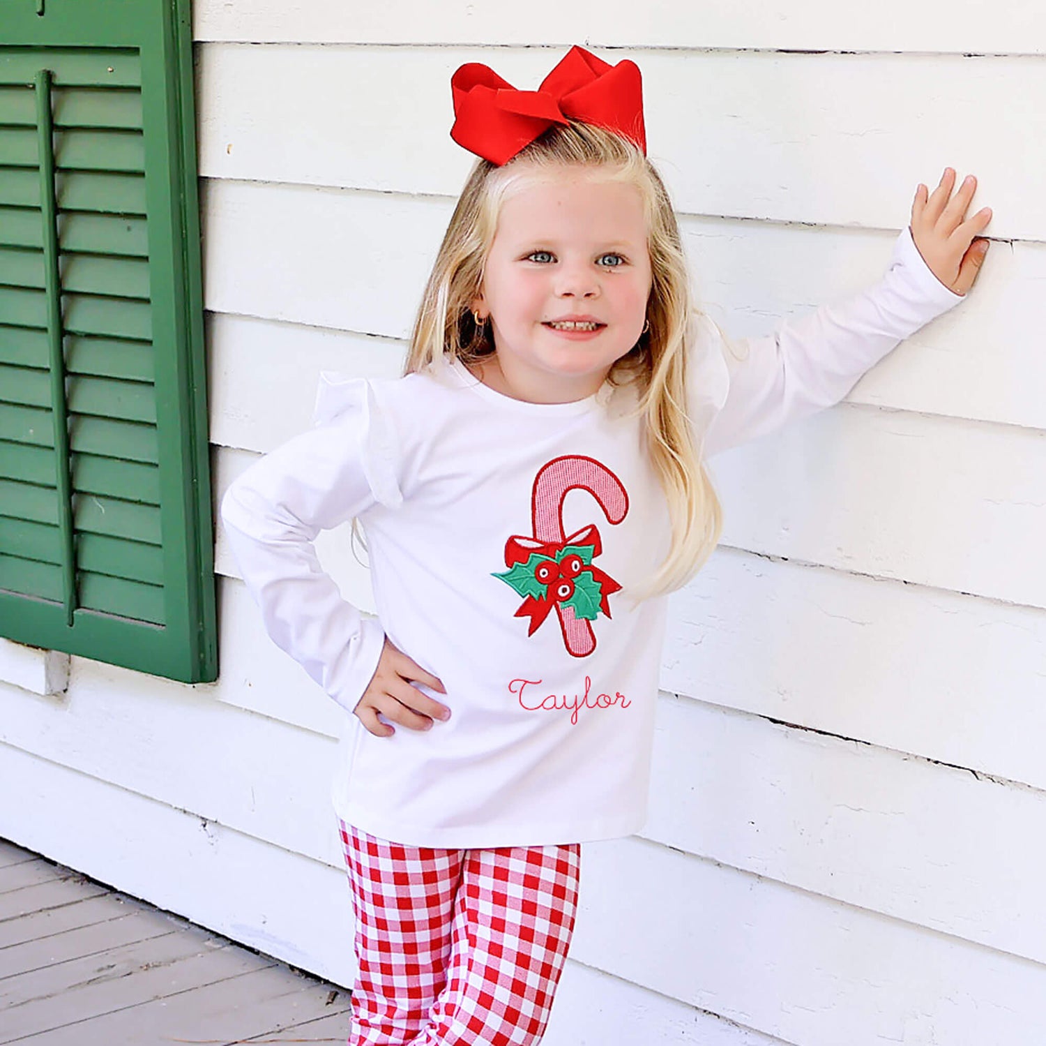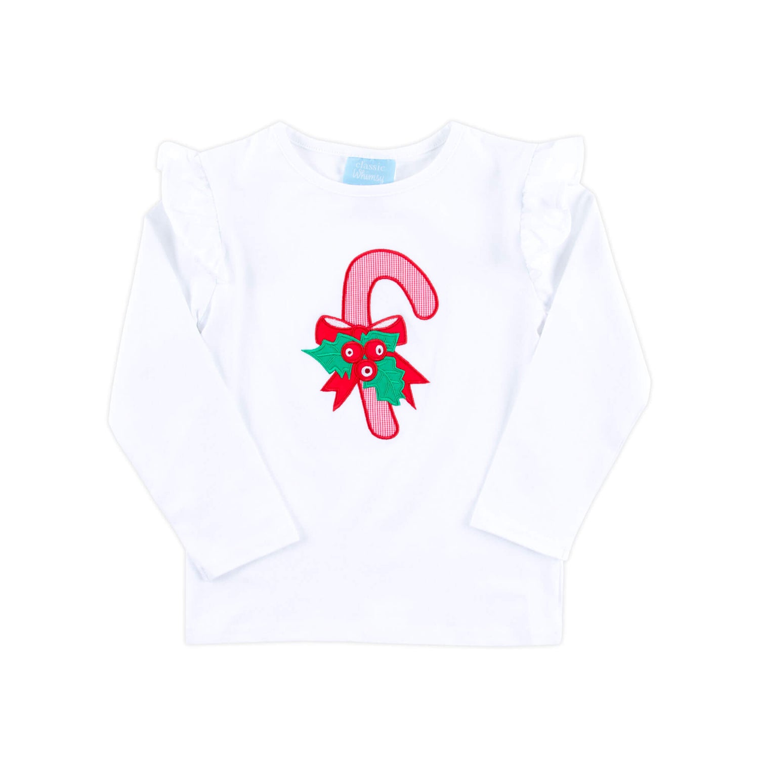 Get ready to spread Christmas cheer with our Candy Cane White Long Sleeve Top! This white knit top features the sweetest applique of a candy cane, and long sleeves with charming ruffle detail. Making it the perfect outfit for holiday parties, playtime fun, comfort, and cuteness! Don't forget to add a monogram for a personalized touch!