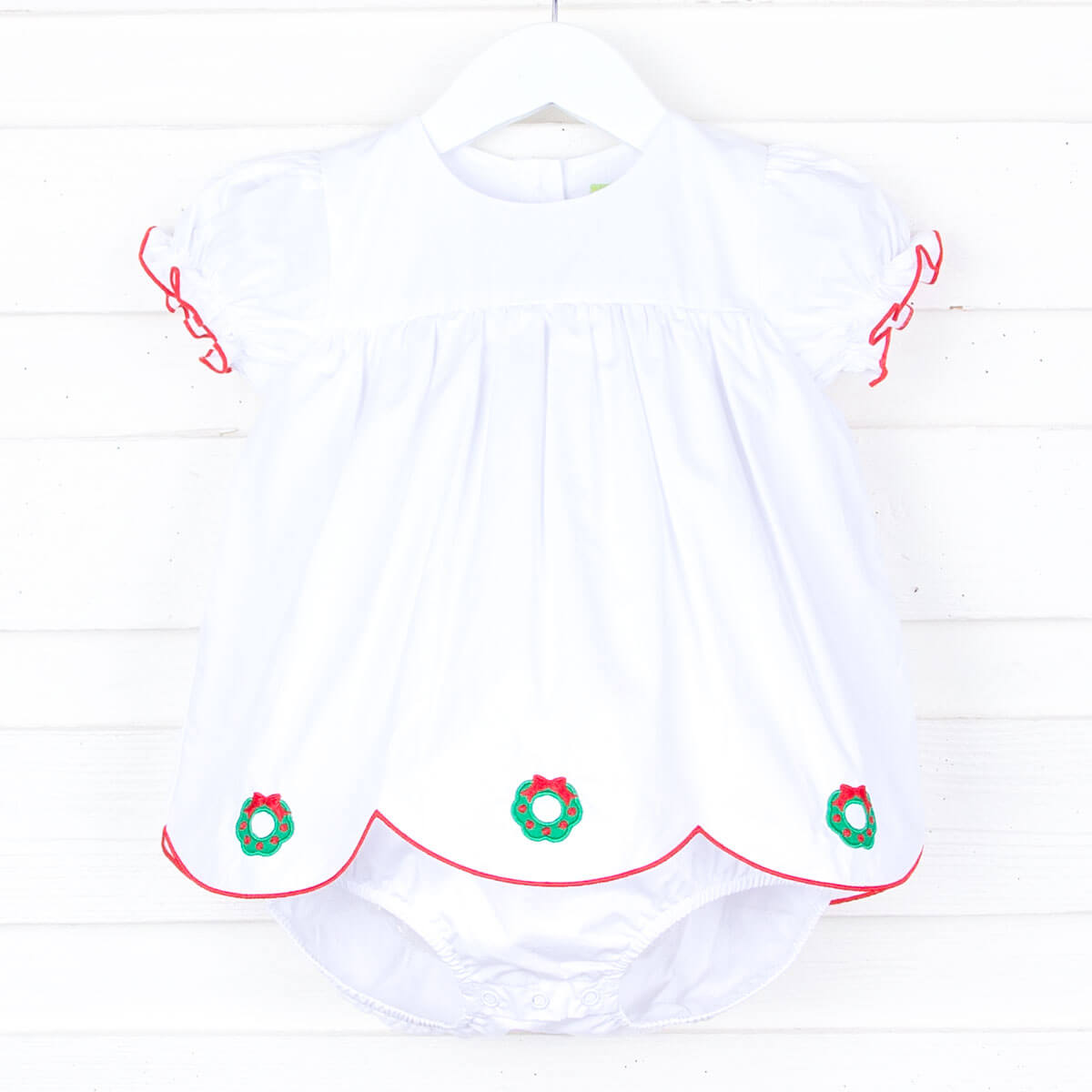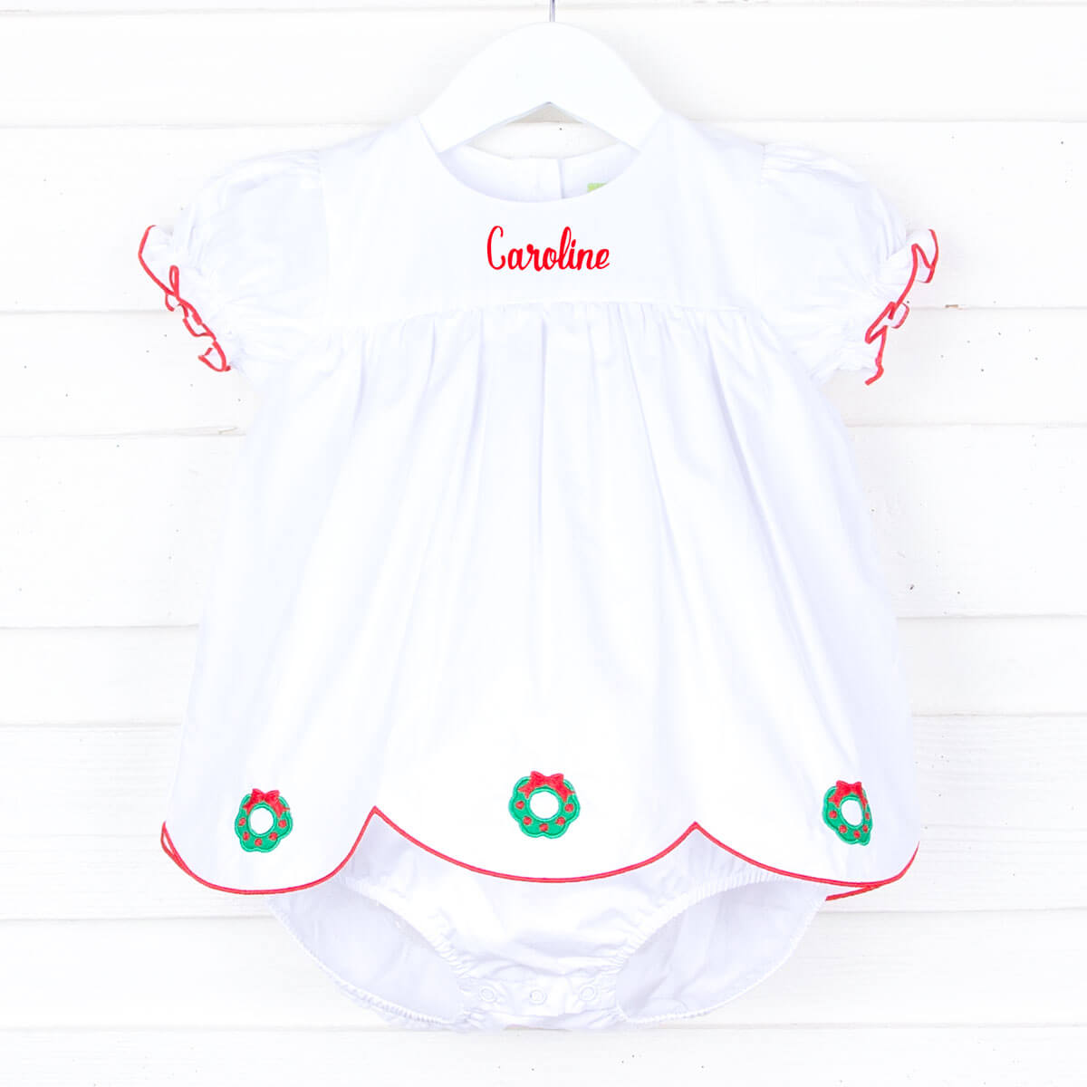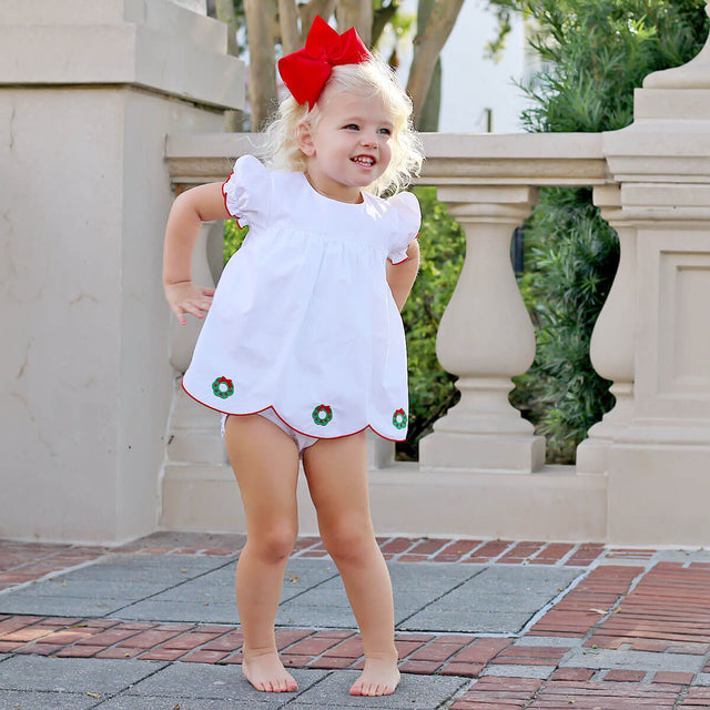 Get into the festive spirit with our Christmas Wreath Bailey Bubble. This sweet and traditional skirted bubble features an embroidered Christmas wreath on solid white fabric, cute bishop sleeves, and a scalloped hem with red trim. Add a monogram to complete the look.