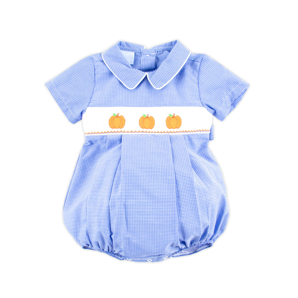 Get your little one picture ready for pumpkin patch adventures in our adorable Cluster Pumpkin Smocked Royal Windowpane Collared Bubble! This charming bubble features hand-smocked cluster pumpkins, a classic collar, and easy snaps in the stride for quick changes. A fall favorite for all your festive outings!
