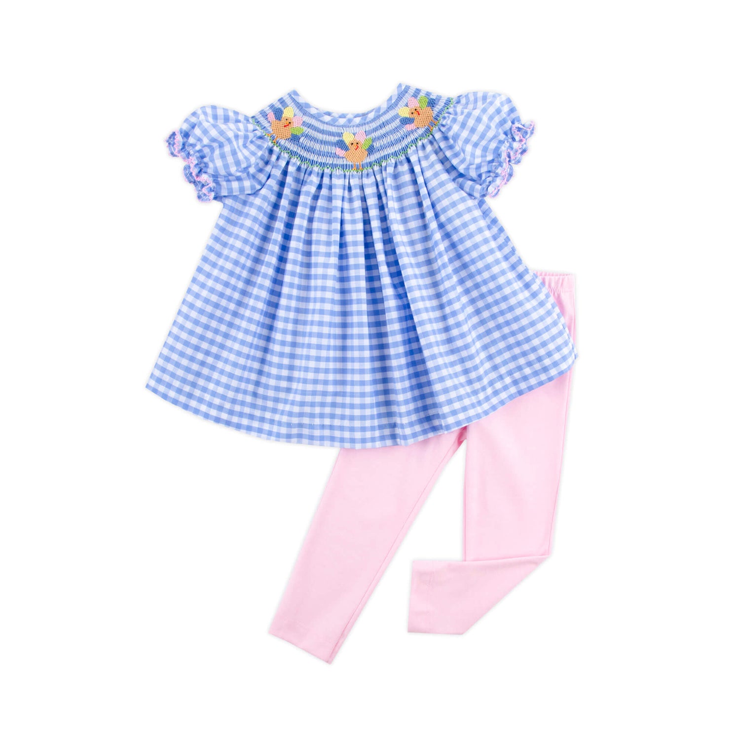 Get your little one ready for your family gathering this Thanksgiving in our Colorful Turkey Smocked Blue Gingham Legging Set! This festive blue gingham top features adorable smocked turkeys and bishop sleeves trimmed with delicate pink picot, making it the perfect choice for holiday gatherings and family celebrations. The coordinated pink knit leggings add a playful touch to this charming outfit.