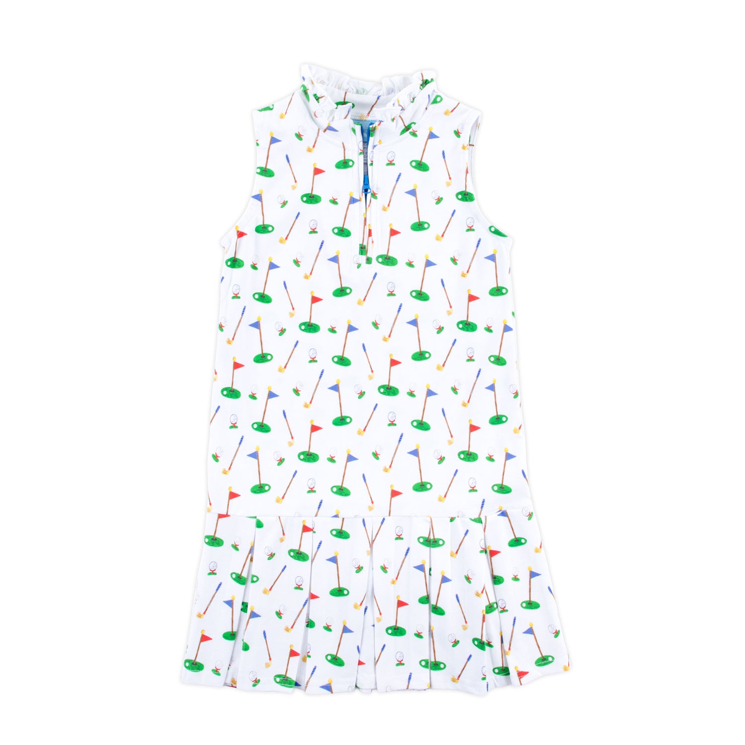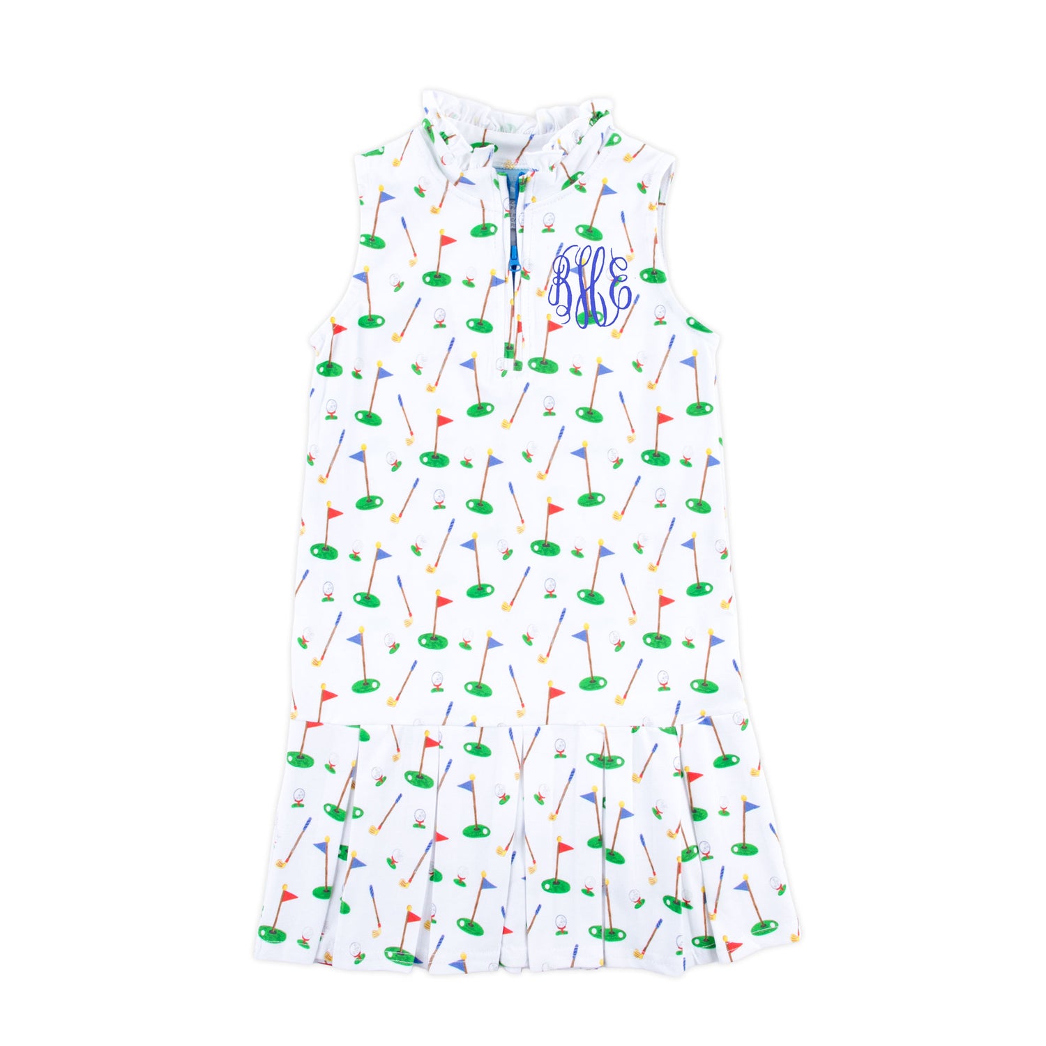Get ready for a golf adventure with the Country Club Zip Sport Dress! This sleeveless knit dress features a sweet golf print, a ruffle-trimmed half zip collar and charming pleated details. Add a monogram for a personalized touch that makes it extra special.
