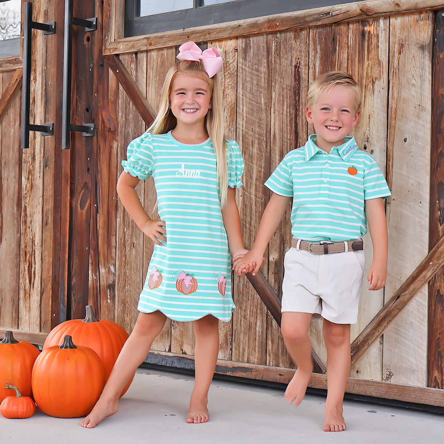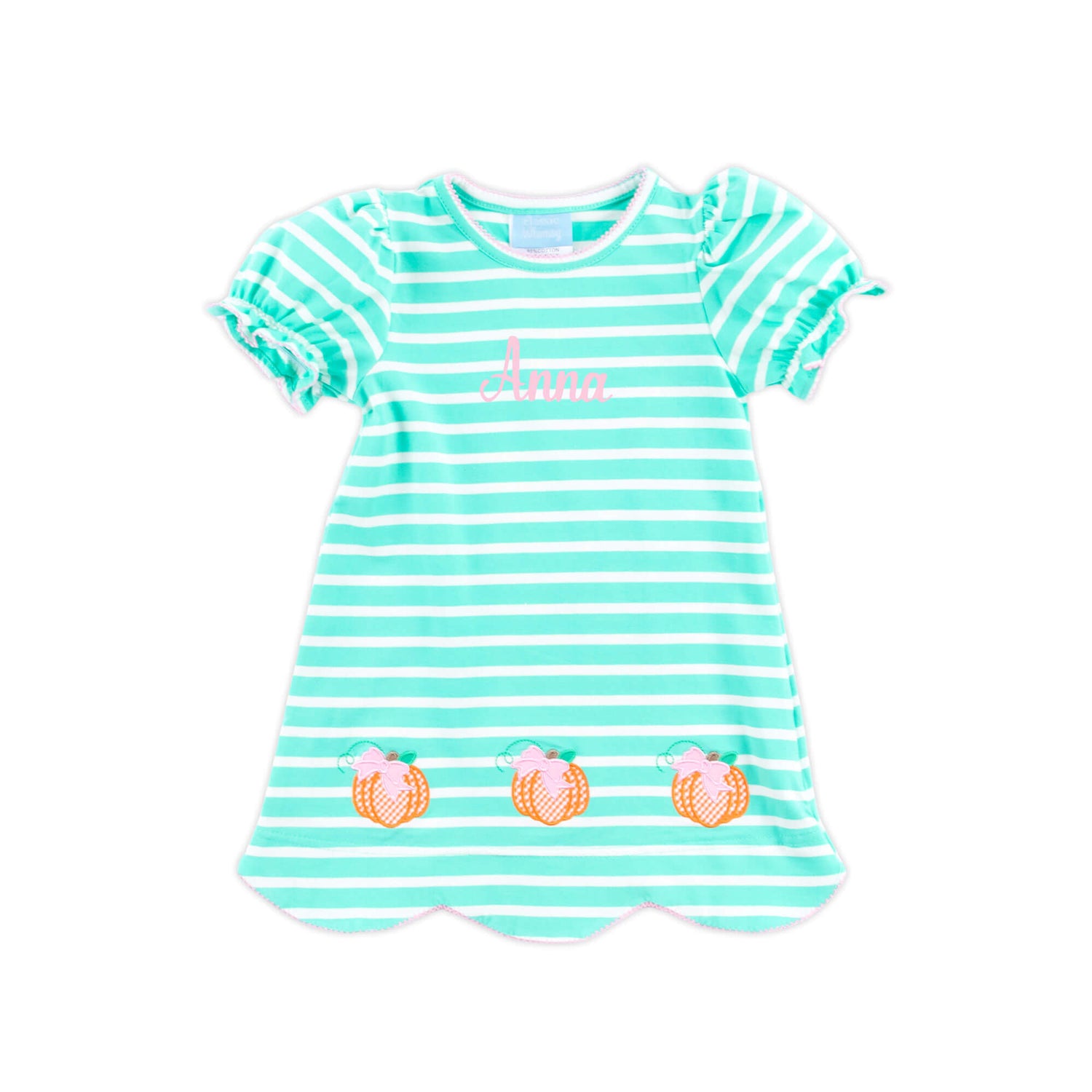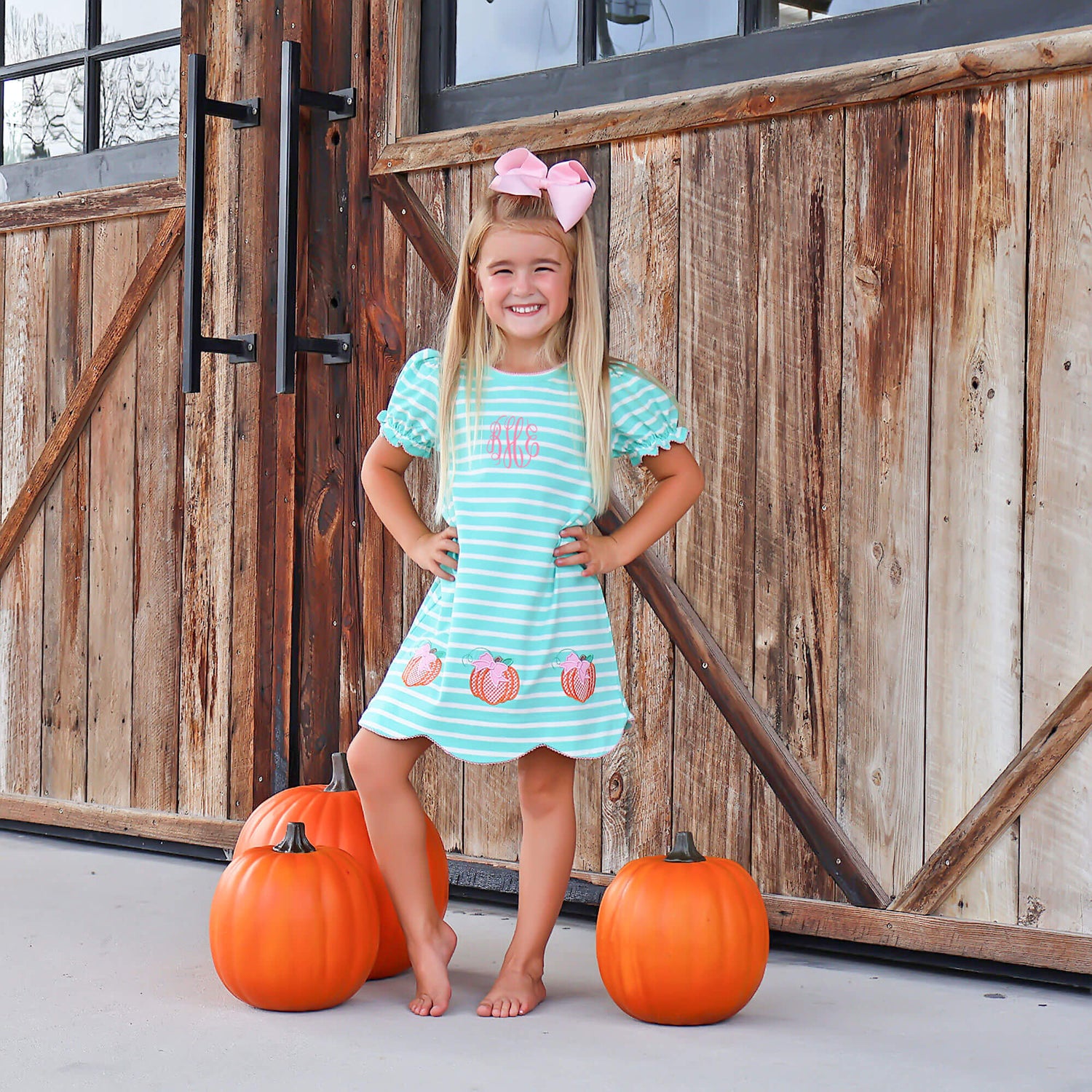Make pumpkin season extra fun with the Cute Harvest Turquoise Stripe Dress! This charming turquoise stripe dress features three adorable pumpkin appliqués along the scalloped hem and bishop sleeves with sweet pink picot trim. Perfect for playtime and pumpkin patch adventures! Add a monogram for a personalized touch.