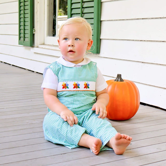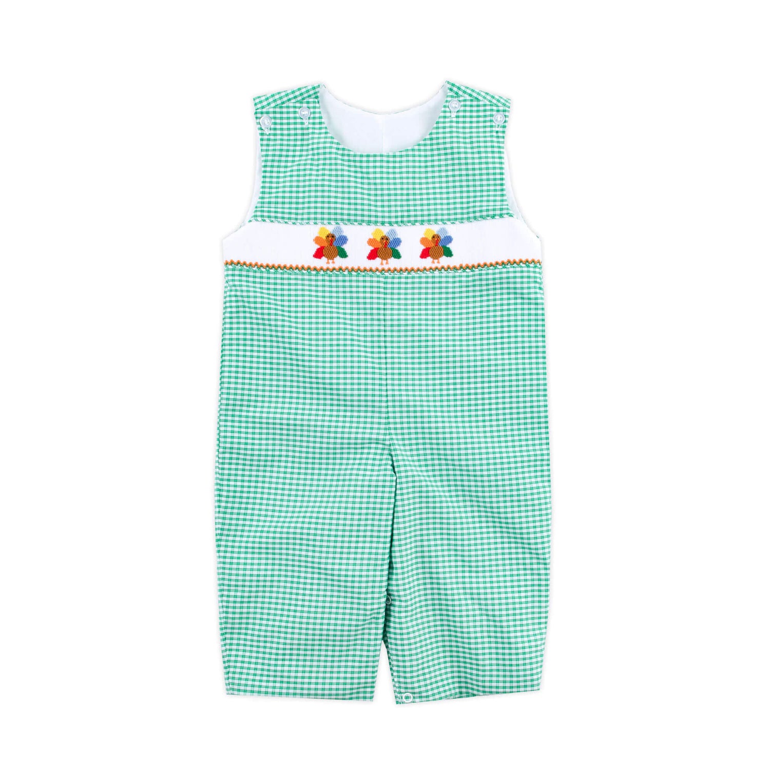 Get your little one ready for your family gathering this Thanksgiving in our Fall Turkey Smocked Green Windowpane Longall! This festive green windowpane longall features three adorable smocked turkeys, making it the perfect choice for holiday gatherings and family celebrations. Shoulder buttons and snaps at the stride make changes easy.
